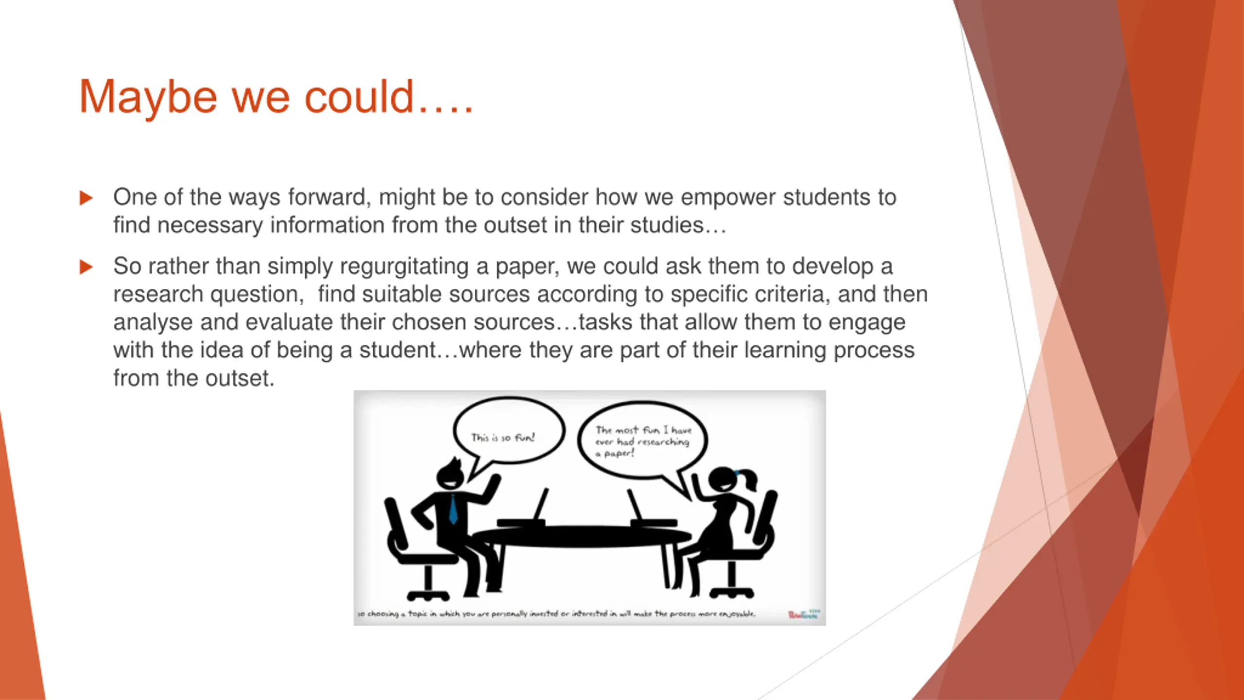 Maybe we could. One of the ways forward, might be to consider how we empower students to find necessary information from the outset in their studies So rather than simply regurgitating a paper, we could ask them to develop a research question, find suitable sources according to specific criteria, and then analyse and evaluate their chosen sources tasks that allow them to engage with the idea of being a student where they are part of their learning process from the outset.