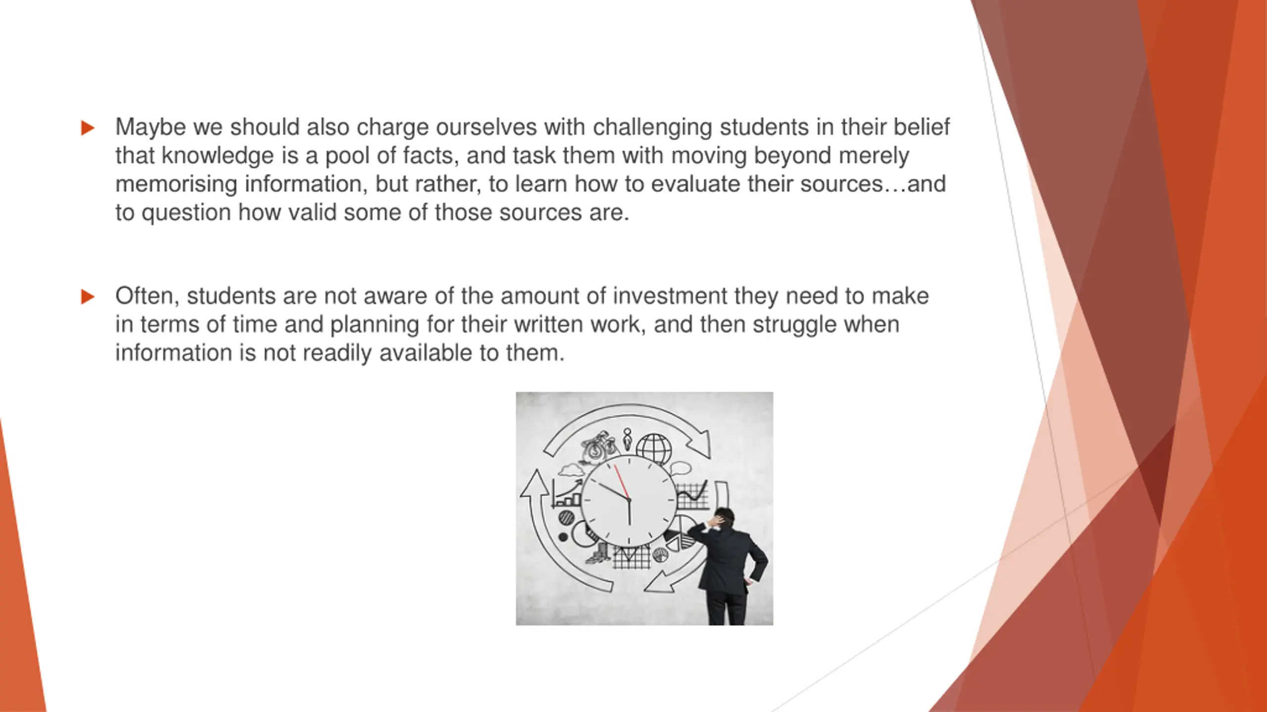 Maybe we should also charge ourselves with challenging students in their belief that knowledge is a pool of facts, and task them with moving beyond merely memorising information, but rather, to learn how to evaluate their sources and to question how valid some of those sources are. Often, students are not aware of the amount of investment they need to make in terms of time and planning for their written work, and then struggle when information is not readily available to them.