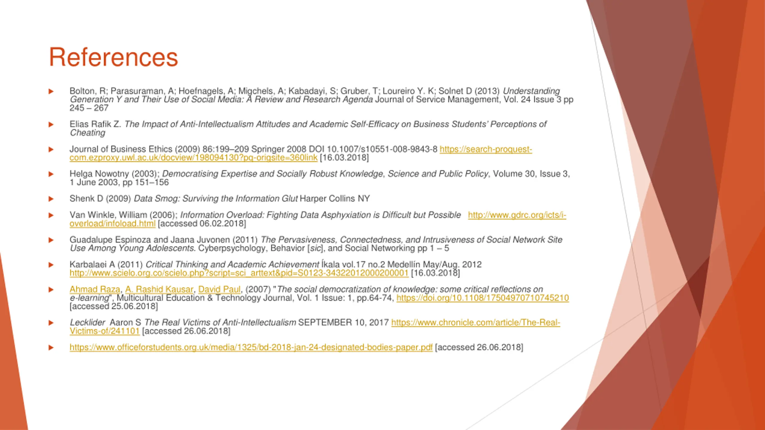 References Bolton, R; Parasuraman, A; Hoefnagels, A; Migchels, A; Kabadayi, S; Gruber, T; Loureiro Y. K; Solnet D (2013) Understanding Generation Y and Their Use of Social Media: A Review and Research Agenda Journal of Service Management, Vol. 24 Issue 3 pp 245 267 Elias Rafik Z. The Impact of Anti-Intellectualism Attitudes and Academic Self-Efficacy on Business Students Perceptions of Cheating Journal of Business Ethics (2009) 86:199 209 Springer 2008 DOI 10.1007/s10551-008-9843-8 https://search-proquest- com.ezproxy.uwl.ac.uk/docview/198094130?pq-origsite=360link [16.03.2018] Helga Nowotny (2003); Democratising Expertise and Socially Robust Knowledge, Science and Public Policy, Volume 30, Issue 3, 1 June 2003, pp 151 156 Shenk D (2009) Data Smog: Surviving the Information Glut Harper Collins NY Van Winkle, William (2006); Information Overload: Fighting Data Asphyxiation is Difficult but Possible http://www.gdrc.org/icts/i- overload/infoload.html [accessed 06.02.2018] Guadalupe Espinoza and Jaana Juvonen (2011) The Pervasiveness, Connectedness, and Intrusiveness of Social Network Site Use Among Young Adolescents. Cyberpsychology, Behavior [sic], and Social Networking pp 1 5 Karbalaei A (2011) Critical Thinking and Academic Achievement kala vol.17 no.2 Medell n May/Aug. 2012 http://www.scielo.org.co/scielo.php?script=sci_arttext&pid=S0123-34322012000200001 [16.03.2018] Ahmad Raza, A. Rashid Kausar, David Paul, (2007) "The social democratization of knowledge: some critical reflections on e learning", Multicultural Education & Technology Journal, Vol. 1 Issue: 1, pp.64-74, https://doi.org/10.1108/17504970710745210 [accessed 25.06.2018] Lecklider Aaron S The Real Victims of Anti-Intellectualism SEPTEMBER 10, 2017 https://www.chronicle.com/article/The-Real- Victims-of/241101 [accessed 26.06.2018] https://www.officeforstudents.org.uk/media/1325/bd-2018-jan-24-designated-bodies-paper.pdf [accessed 26.06.2018]