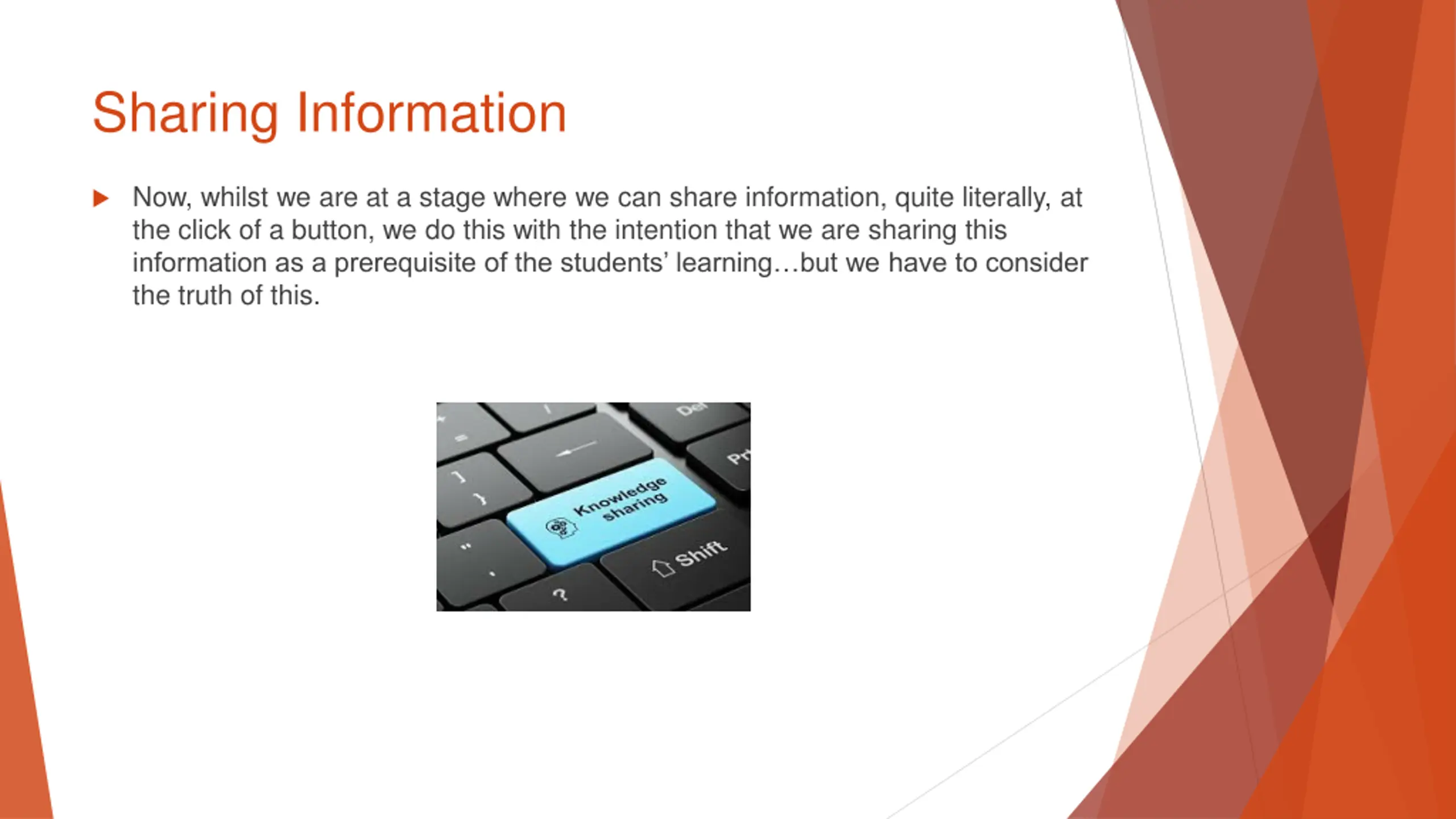 Sharing Information Now, whilst we are at a stage where we can share information, quite literally, at the click of a button, we do this with the intention that we are sharing this information as a prerequisite of the students learning but we have to consider the truth of this.