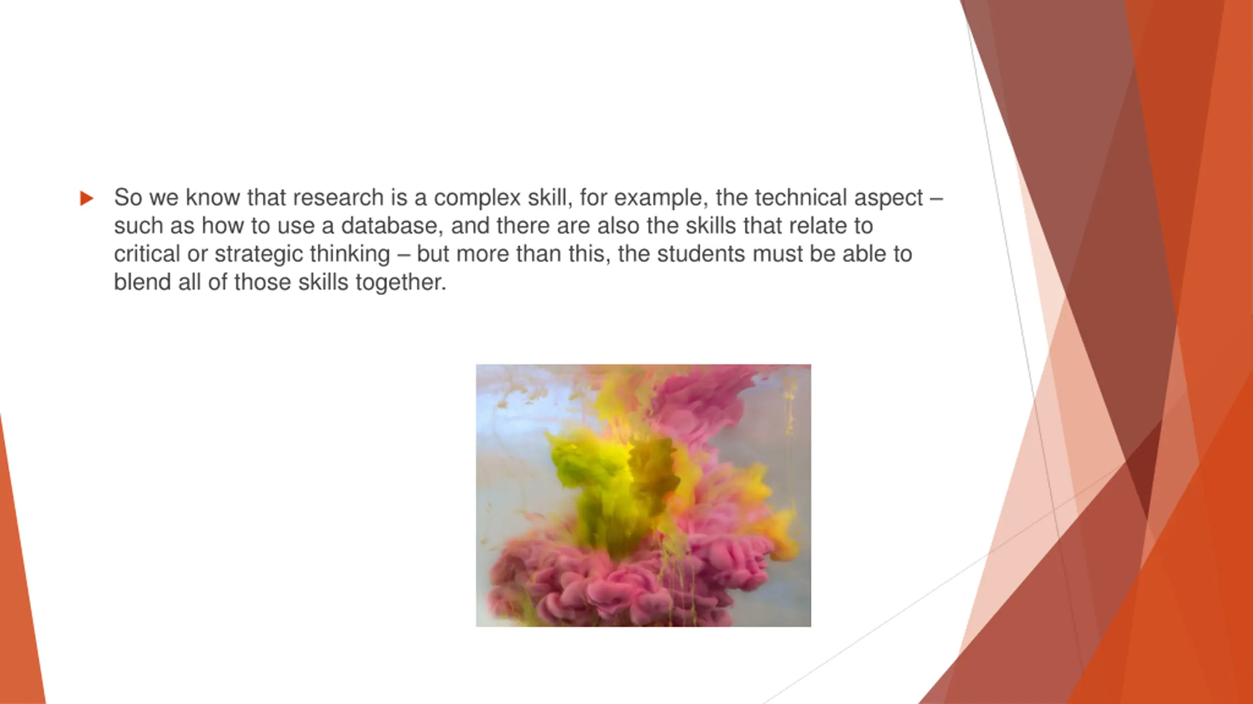 So we know that research is a complex skill, for example, the technical aspect such as how to use a database, and there are also the skills that relate to critical or strategic thinking but more than this, the students must be able to blend all of those skills together.