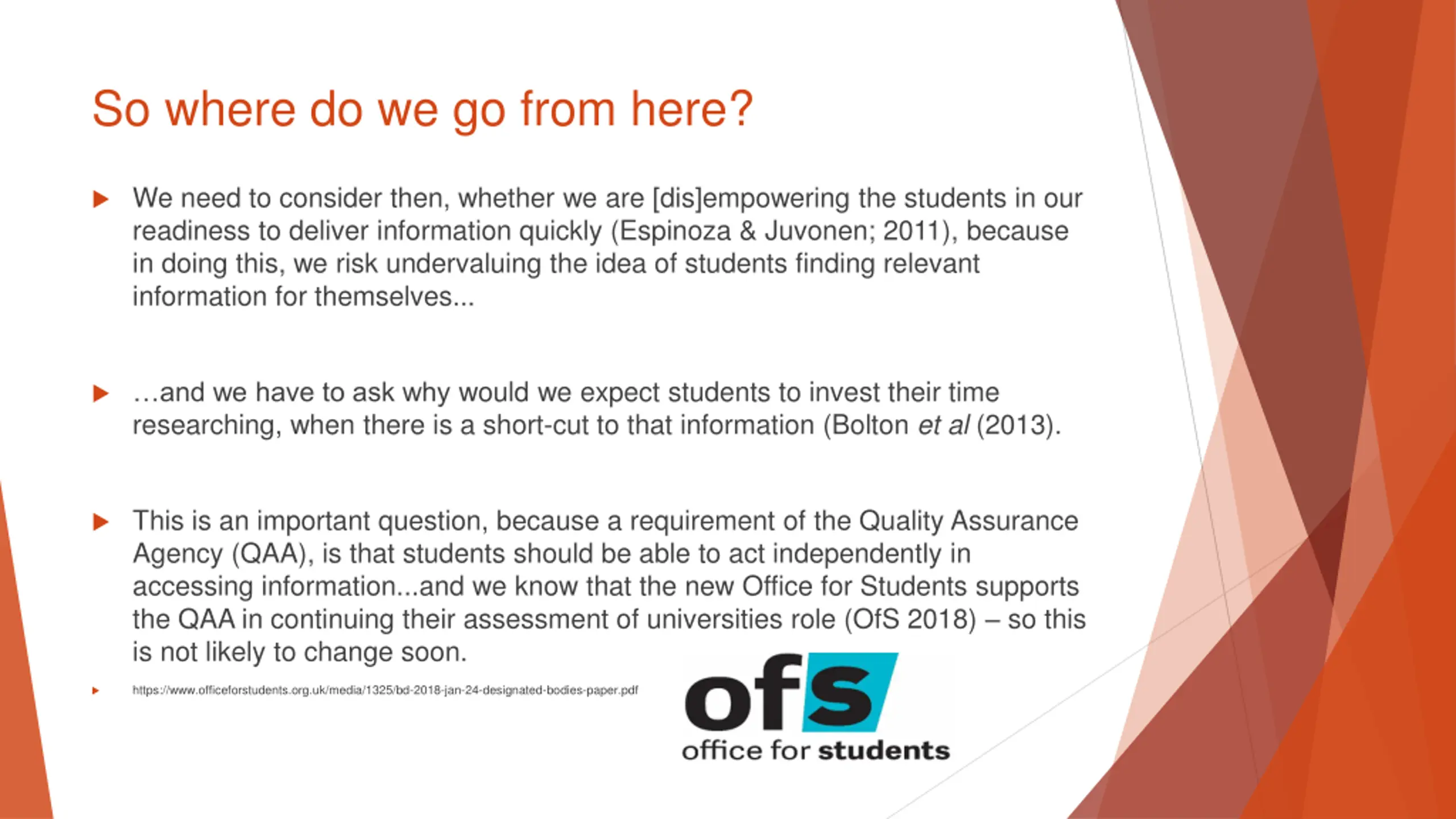 So where do we go from here? We need to consider then, whether we are [dis]empowering the students in our readiness to deliver information quickly (Espinoza & Juvonen; 2011), because in doing this, we risk undervaluing the idea of students finding relevant information for themselves... and we have to ask why would we expect students to invest their time researching, when there is a short-cut to that information (Bolton et al (2013). This is an important question, because a requirement of the Quality Assurance Agency (QAA), is that students should be able to act independently in accessing information...and we know that the new Office for Students supports the QAA in continuing their assessment of universities role (OfS 2018) so this is not likely to change soon. https://www.officeforstudents.org.uk/media/1325/bd-2018-jan-24-designated-bodies-paper.pdf