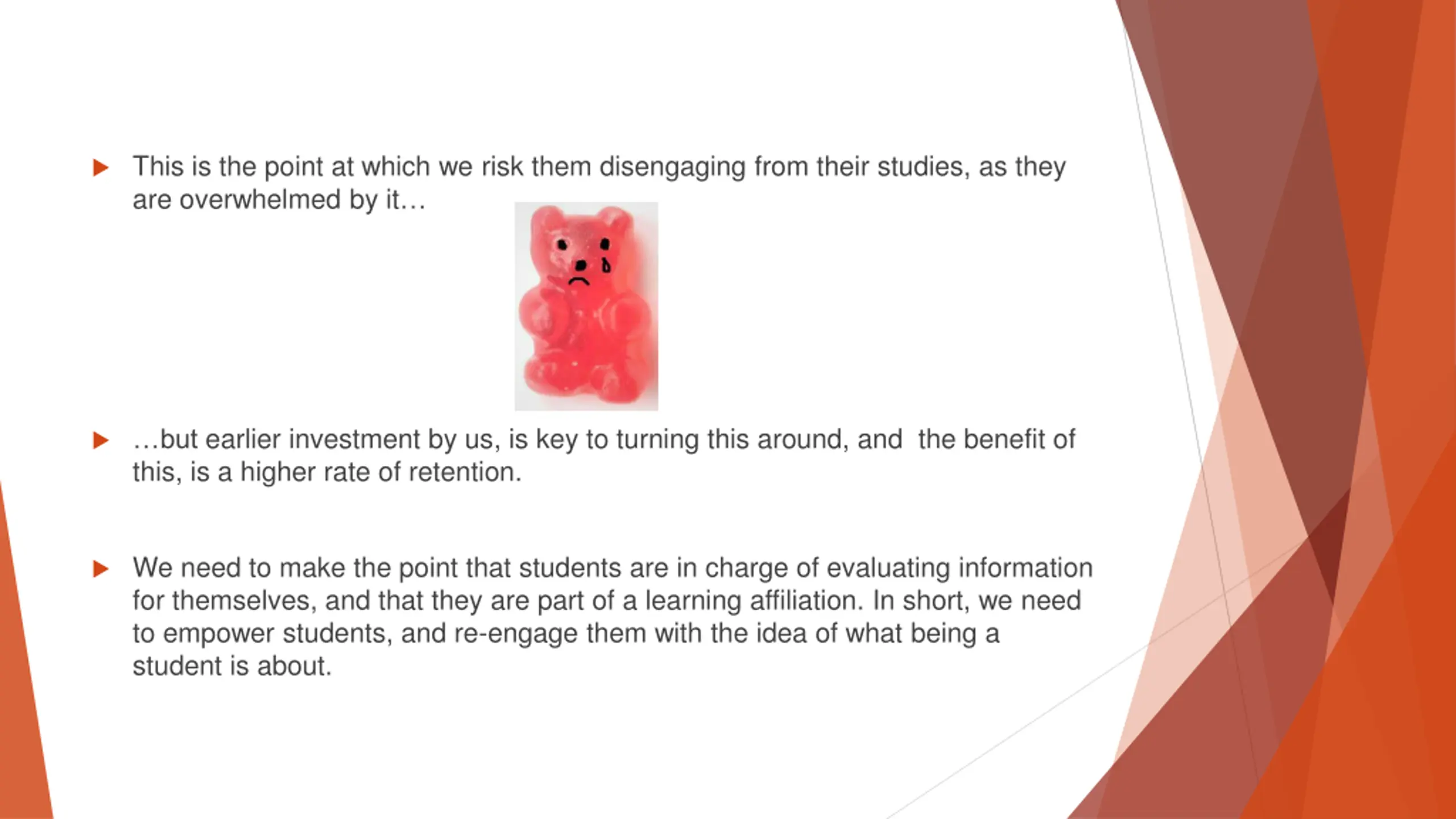 This is the point at which we risk them disengaging from their studies, as they are overwhelmed by it but earlier investment by us, is key to turning this around, and the benefit of this, is a higher rate of retention. We need to make the point that students are in charge of evaluating information for themselves, and that they are part of a learning affiliation. In short, we need to empower students, and re-engage them with the idea of what being a student is about.