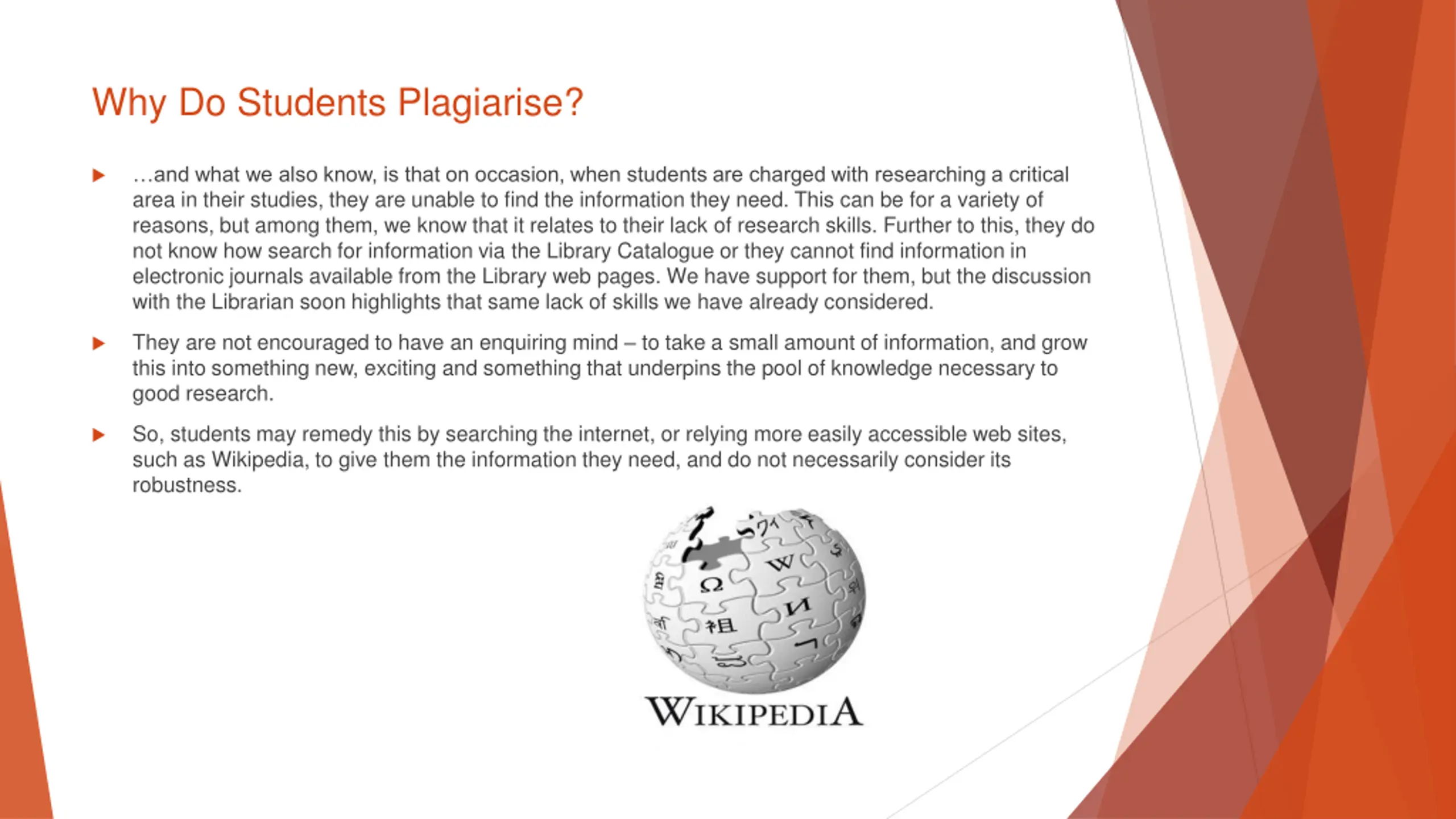 Why Do Students Plagiarise? and what we also know, is that on occasion, when students are charged with researching a critical area in their studies, they are unable to find the information they need. This can be for a variety of reasons, but among them, we know that it relates to their lack of research skills. Further to this, they do not know how search for information via the Library Catalogue or they cannot find information in electronic journals available from the Library web pages. We have support for them, but the discussion with the Librarian soon highlights that same lack of skills we have already considered. They are not encouraged to have an enquiring mind to take a small amount of information, and grow this into something new, exciting and something that underpins the pool of knowledge necessary to good research. So, students may remedy this by searching the internet, or relying more easily accessible web sites, such as Wikipedia, to give them the information they need, and do not necessarily consider its robustness.