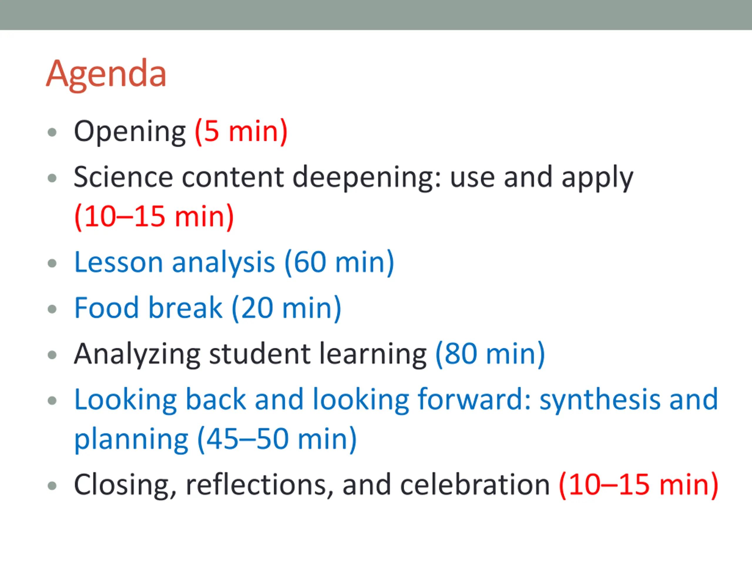 Agenda Opening (5 min) Science content deepening: use and apply (10 15 min) Lesson analysis (60 min) Food break (20 min) Analyzing student learning (80 min) Looking back and looking forward: synthesis and planning (45 50 min) Closing, reflections, and celebration (10 15 min)