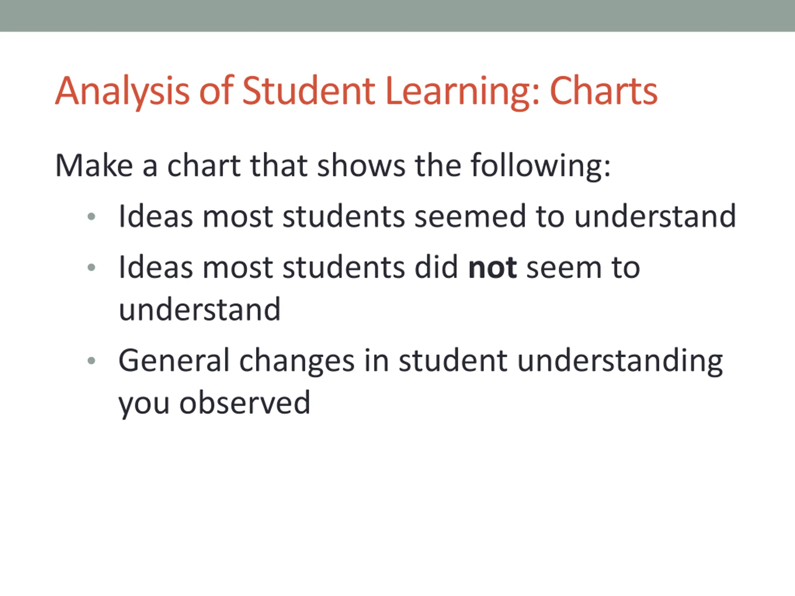 Analysis of Student Learning: Charts Make a chart that shows the following: Ideas most students seemed to understand Ideas most students did not seem to understand General changes in student understanding you observed