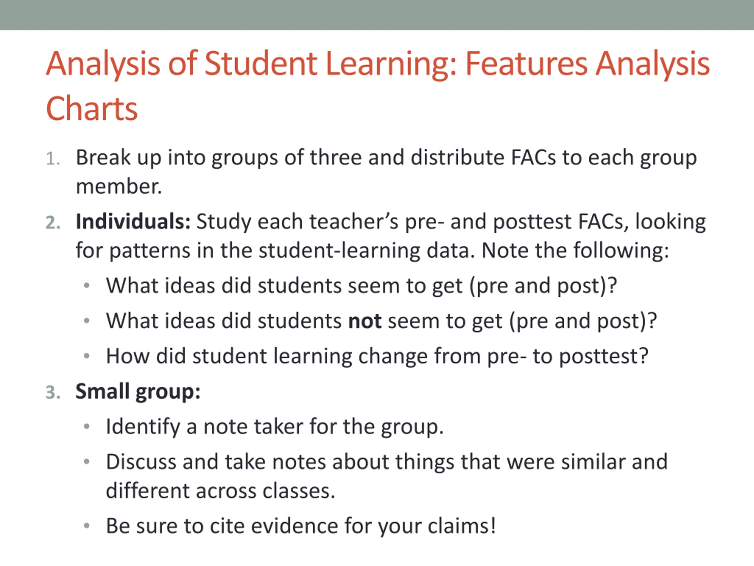 Analysis of Student Learning: Features Analysis Charts 1. Break up into groups of three and distribute FACs to each group member. 2. Individuals: Study each teacher s pre- and posttest FACs, looking for patterns in the student-learning data. Note the following: What ideas did students seem to get (pre and post)? What ideas did students not seem to get (pre and post)? How did student learning change from pre- to posttest? 3. Small group: Identify a note taker for the group. Discuss and take notes about things that were similar and different across classes. Be sure to cite evidence for your claims!