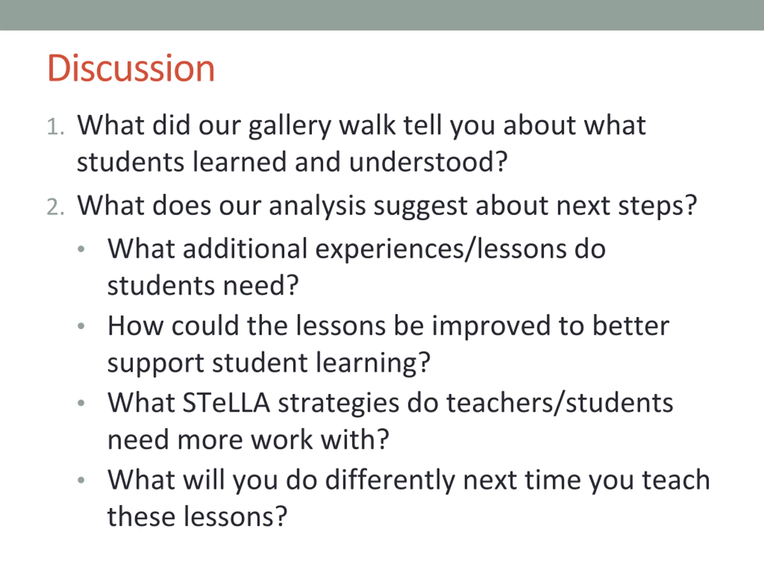 Discussion 1. What did our gallery walk tell you about what students learned and understood? 2. What does our analysis suggest about next steps? What additional experiences/lessons do students need? How could the lessons be improved to better support student learning? What STeLLA strategies do teachers/students need more work with? What will you do differently next time you teach these lessons?