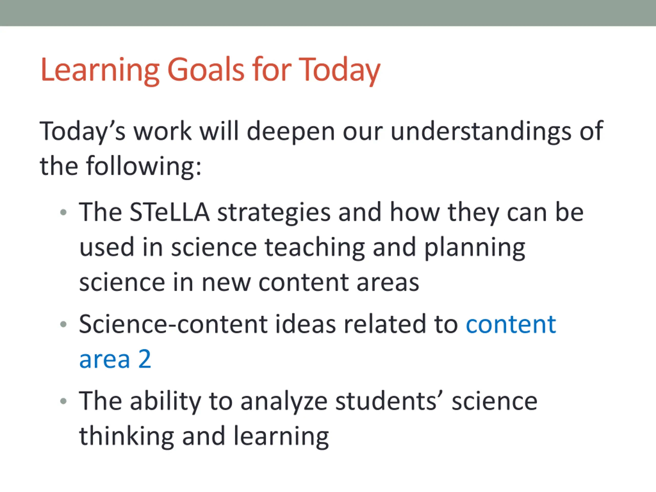 Learning Goals for Today Today s work will deepen our understandings of the following: The STeLLA strategies and how they can be used in science teaching and planning science in new content areas Science-content ideas related to content area 2 The ability to analyze students science thinking and learning