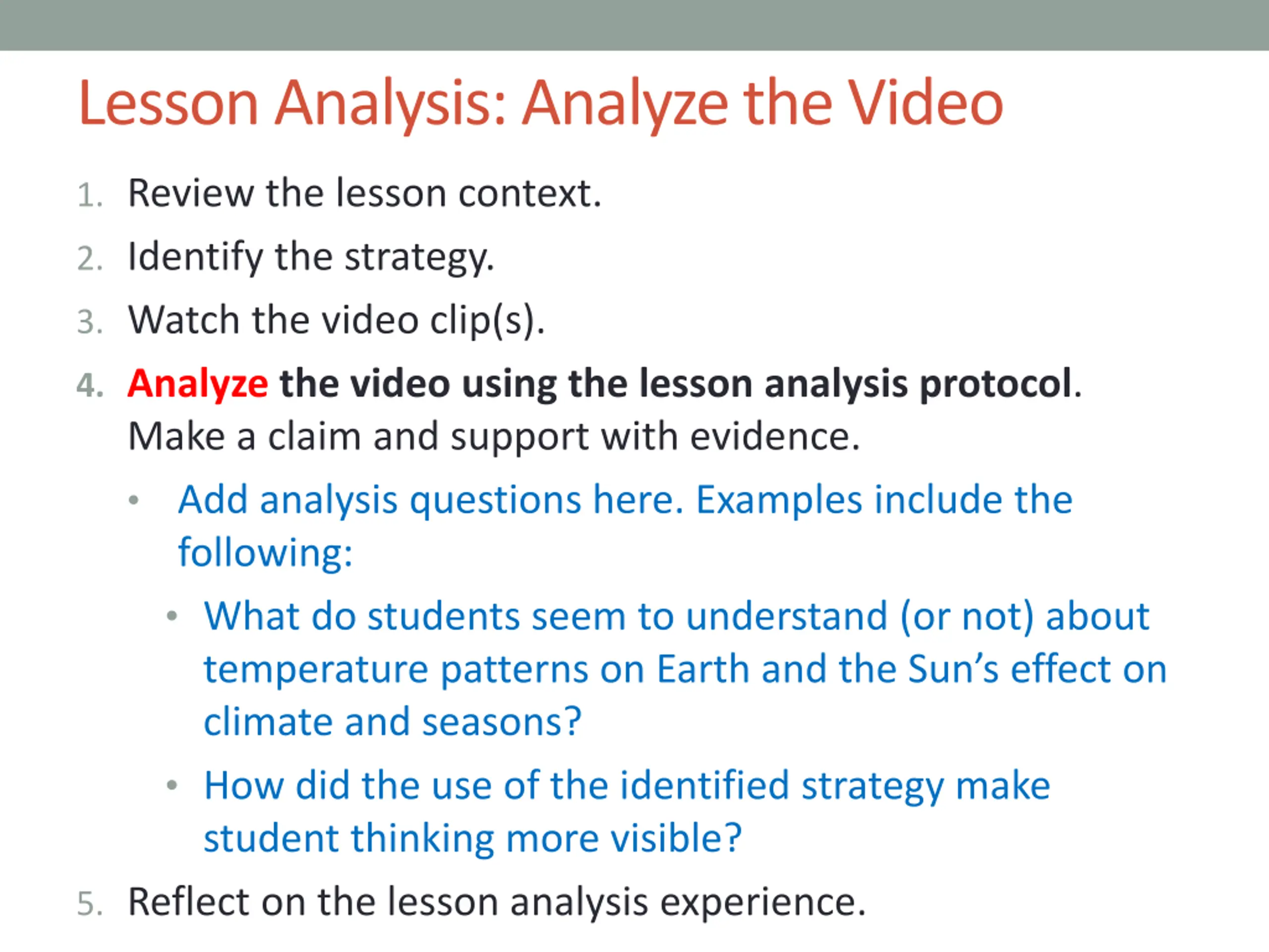 Lesson Analysis: Analyze the Video 1. Review the lesson context. 2. Identify the strategy. 3. Watch the video clip(s). 4. Analyze the video using the lesson analysis protocol. Make a claim and support with evidence. Add analysis questions here. Examples include the following: What do students seem to understand (or not) about temperature patterns on Earth and the Sun s effect on climate and seasons? How did the use of the identified strategy make student thinking more visible? 5. Reflect on the lesson analysis experience.