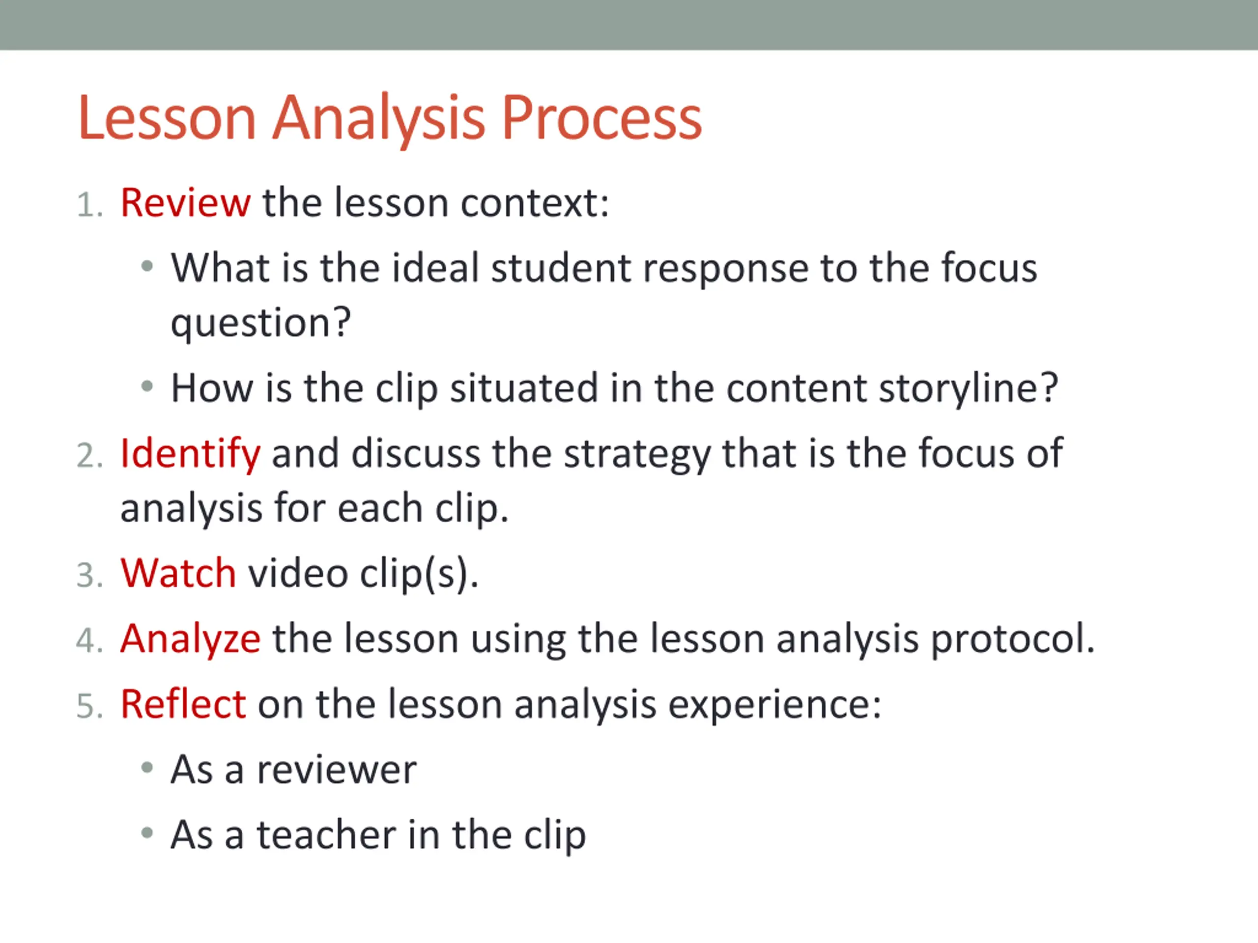 Lesson Analysis Process 1. Review the lesson context: What is the ideal student response to the focus question? How is the clip situated in the content storyline? 2. Identify and discuss the strategy that is the focus of analysis for each clip. 3. Watch video clip(s). 4. Analyze the lesson using the lesson analysis protocol. 5. Reflect on the lesson analysis experience: As a reviewer As a teacher in the clip