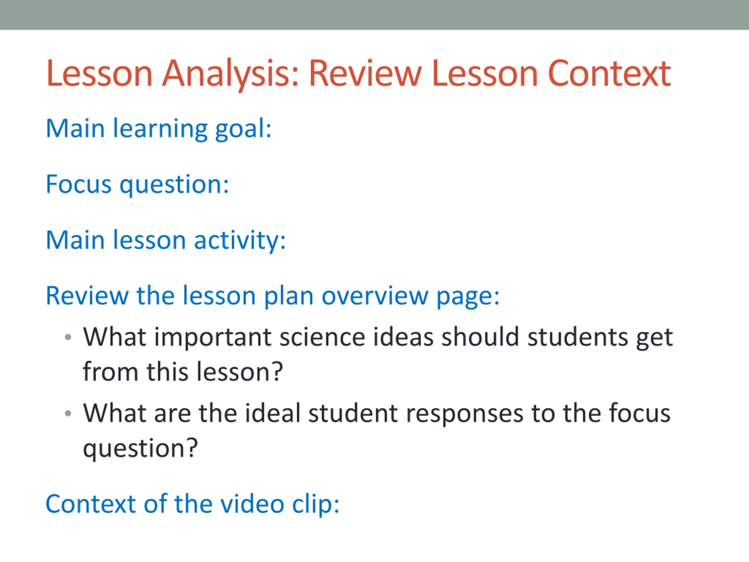 Lesson Analysis: Review Lesson Context Main learning goal: Focus question: Main lesson activity: Review the lesson plan overview page: What important science ideas should students get from this lesson? What are the ideal student responses to the focus question? Context of the video clip: