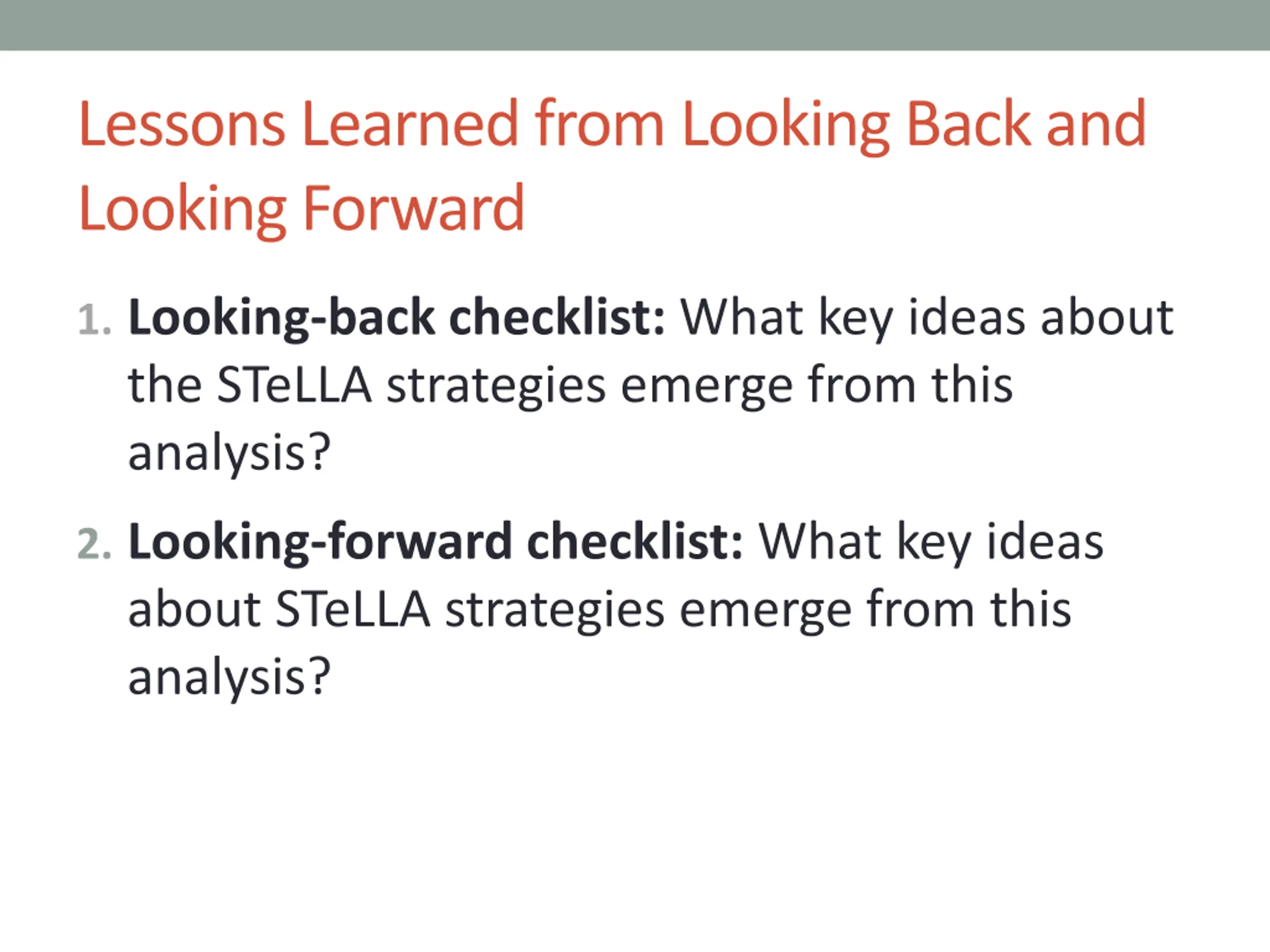 Lessons Learned from Looking Back and Looking Forward 1. Looking-back checklist: What key ideas about the STeLLA strategies emerge from this analysis? 2. Looking-forward checklist: What key ideas about STeLLA strategies emerge from this analysis?