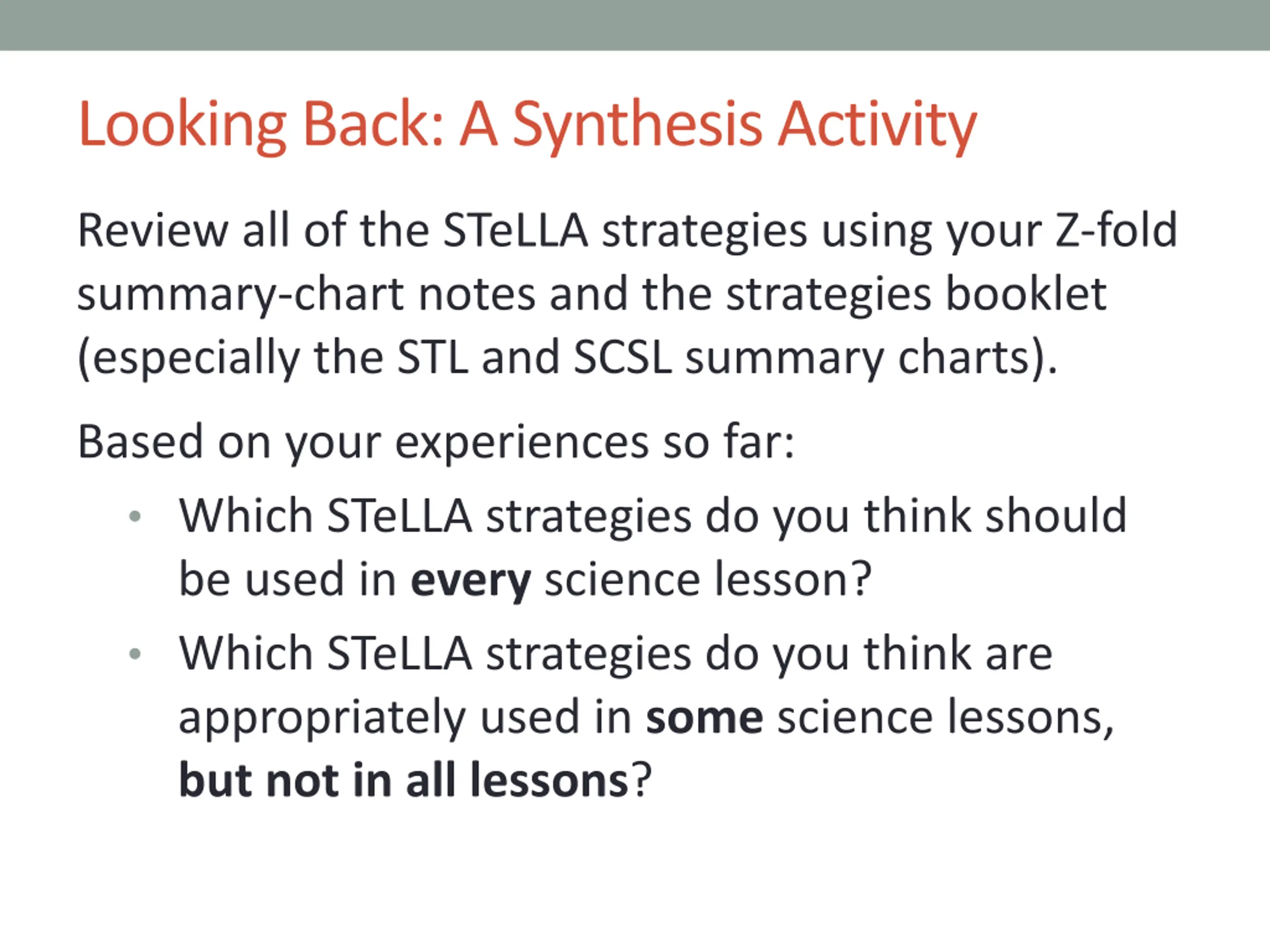 Looking Back: A Synthesis Activity Review all of the STeLLA strategies using your Z-fold summary-chart notes and the strategies booklet (especially the STL and SCSL summary charts). Based on your experiences so far: Which STeLLA strategies do you think should be used in every science lesson? Which STeLLA strategies do you think are appropriately used in some science lessons, but not in all lessons?