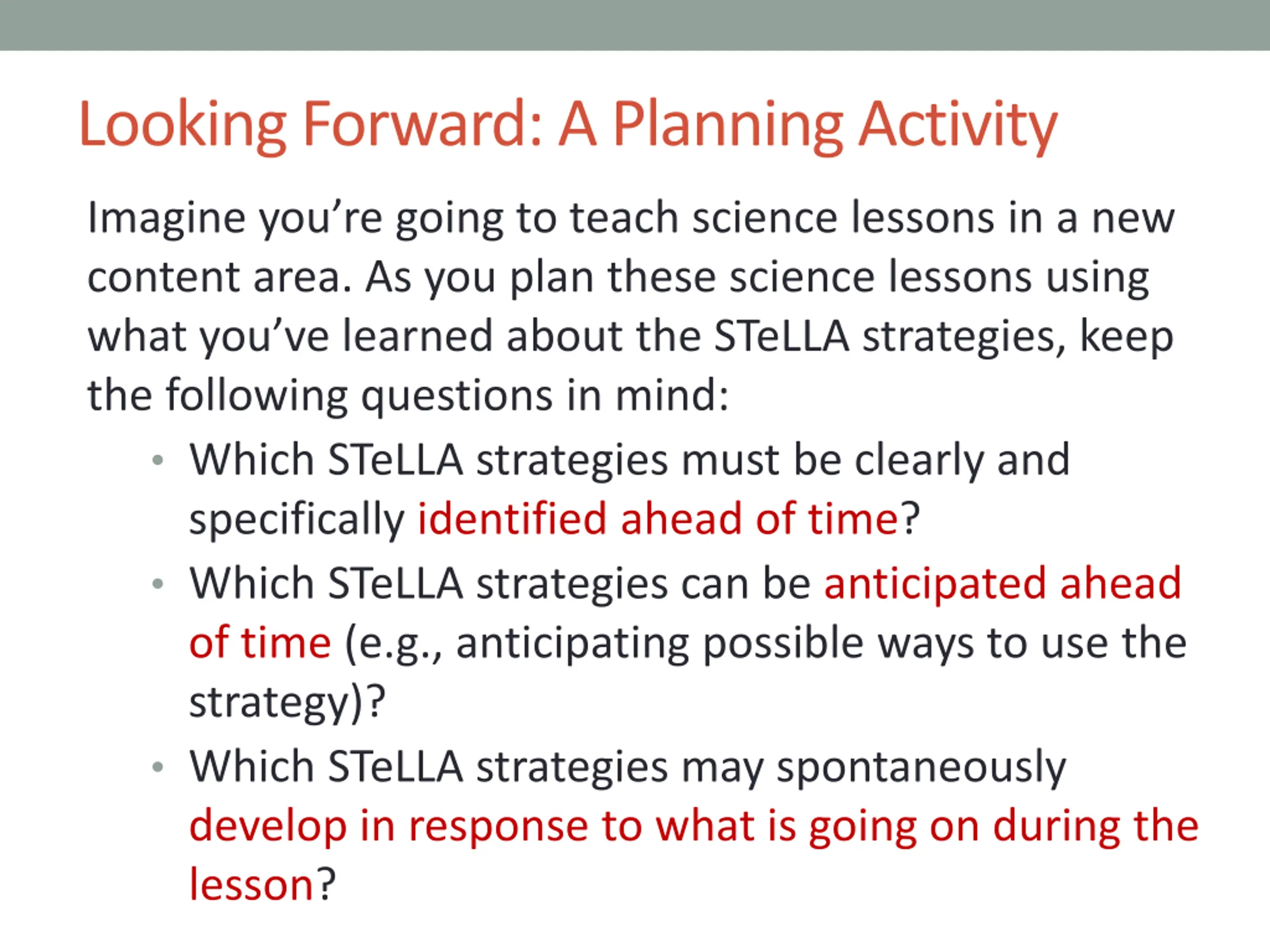 Looking Forward: A Planning Activity Imagine you re going to teach science lessons in a new content area. As you plan these science lessons using what you ve learned about the STeLLA strategies, keep the following questions in mind: Which STeLLA strategies must be clearly and specifically identified ahead of time? Which STeLLA strategies can be anticipated ahead of time (e.g., anticipating possible ways to use the strategy)? Which STeLLA strategies may spontaneously develop in response to what is going on during the lesson?