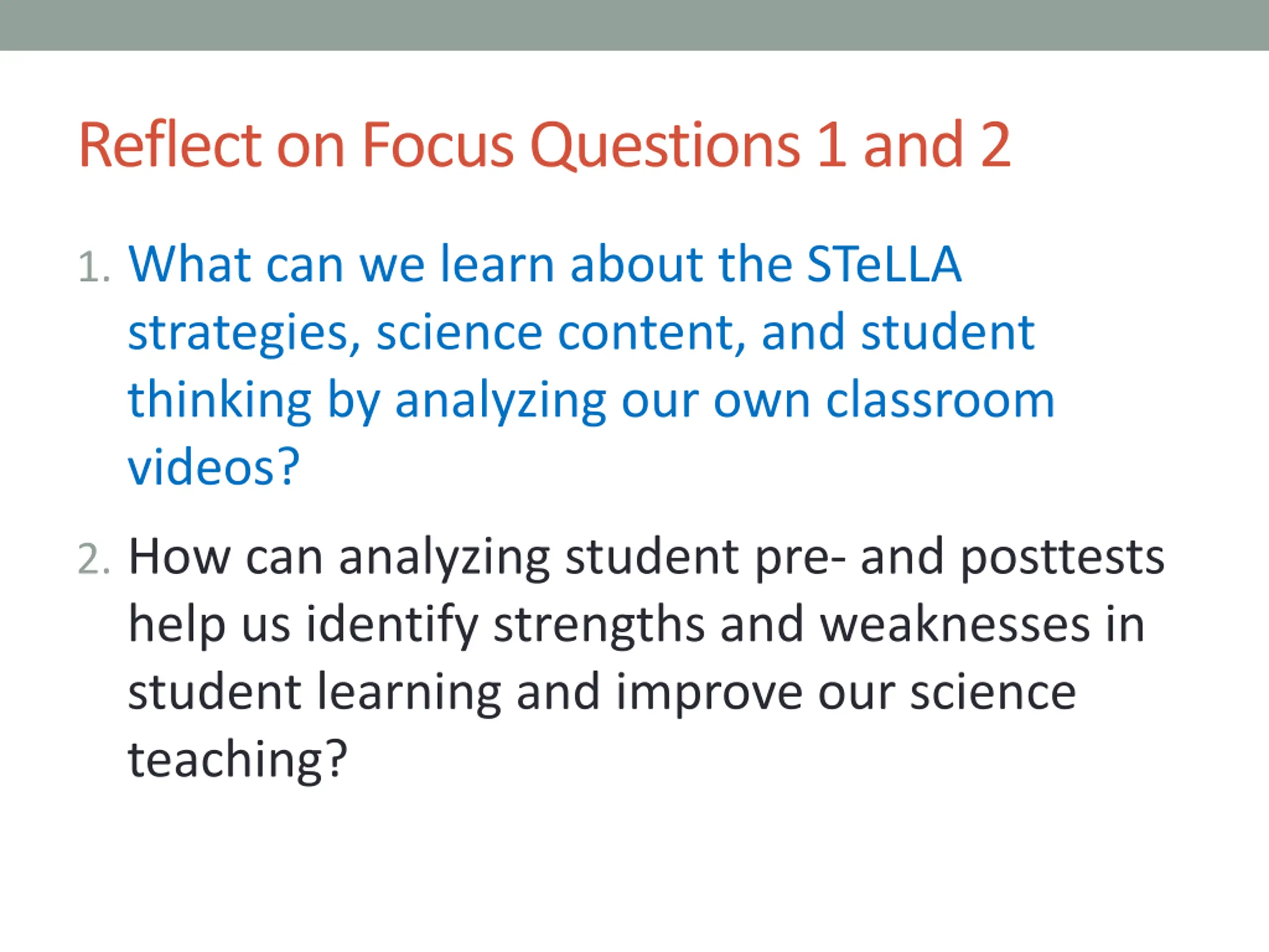 Reflect on Focus Questions 1 and 2 1. What can we learn about the STeLLA strategies, science content, and student thinking by analyzing our own classroom videos? 2. How can analyzing student pre- and posttests help us identify strengths and weaknesses in student learning and improve our science teaching?