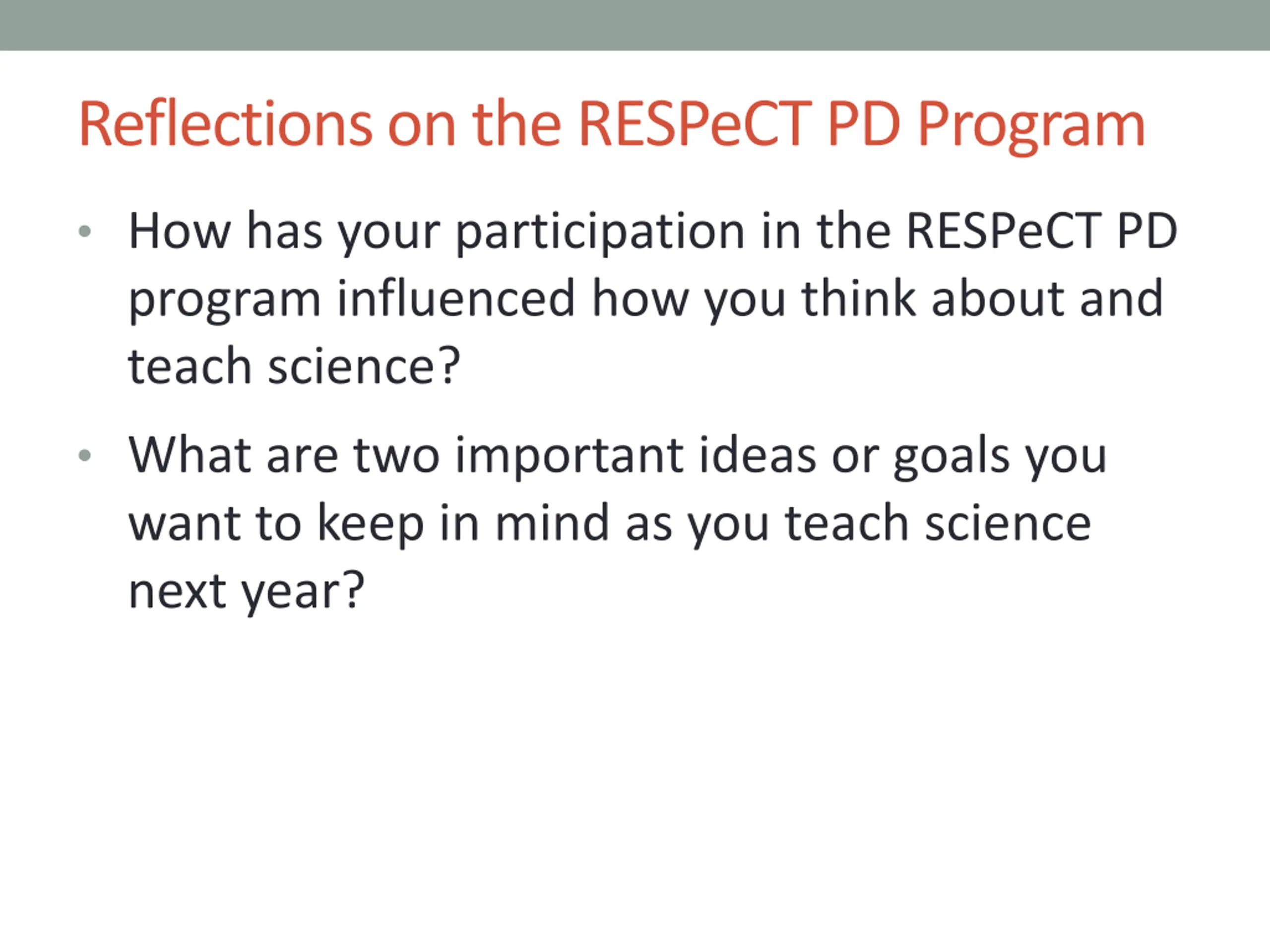 Reflections on the RESPeCT PD Program How has your participation in the RESPeCT PD program influenced how you think about and teach science? What are two important ideas or goals you want to keep in mind as you teach science next year?