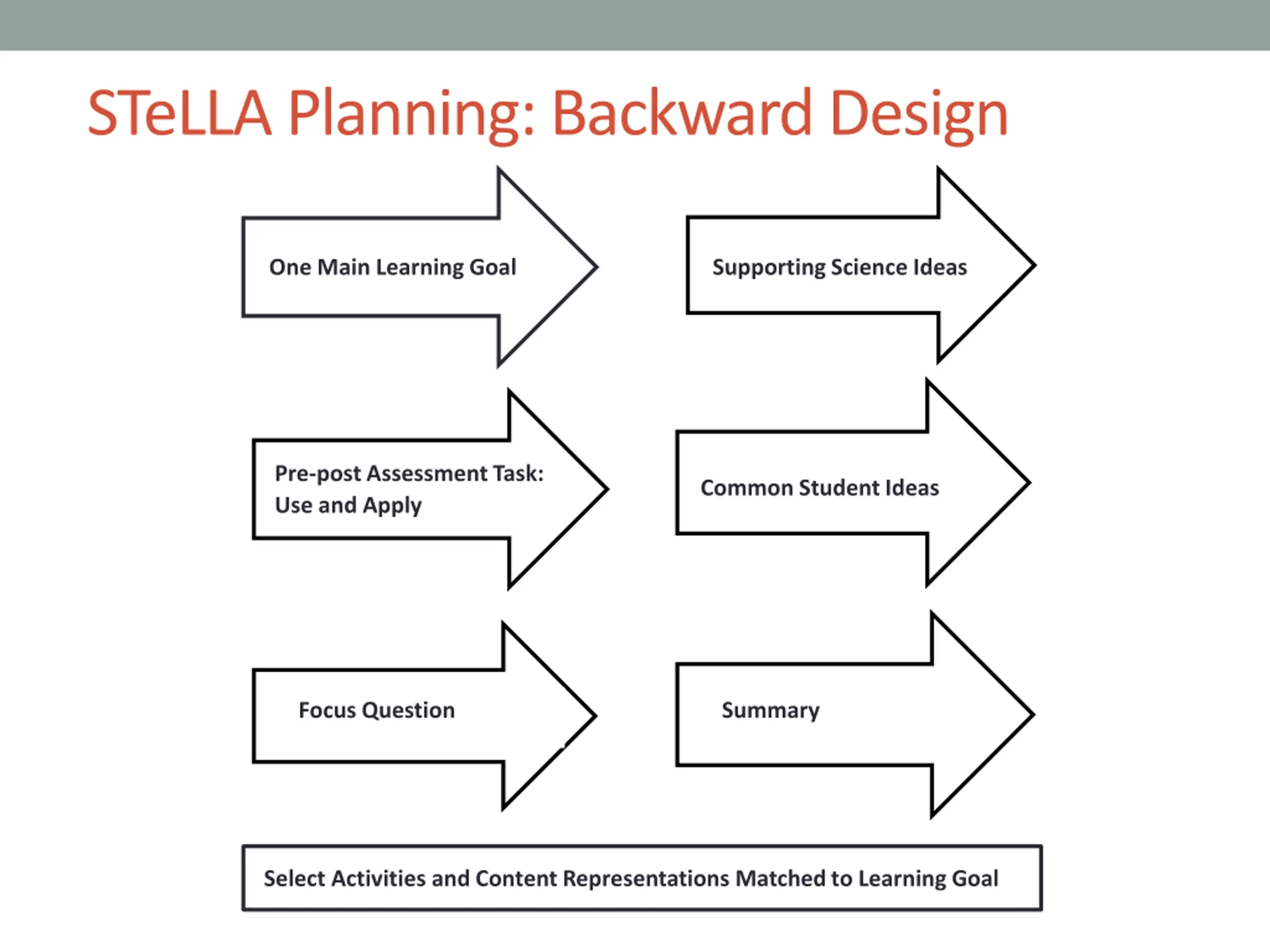STeLLA Planning: Backward Design One Main Learning Goal SupportingScience Ideas Pre-post Assessment Task: Use and Apply Common Student Ideas Focus Question Summary Select Activities and Content Representations Matched to Learning Goal