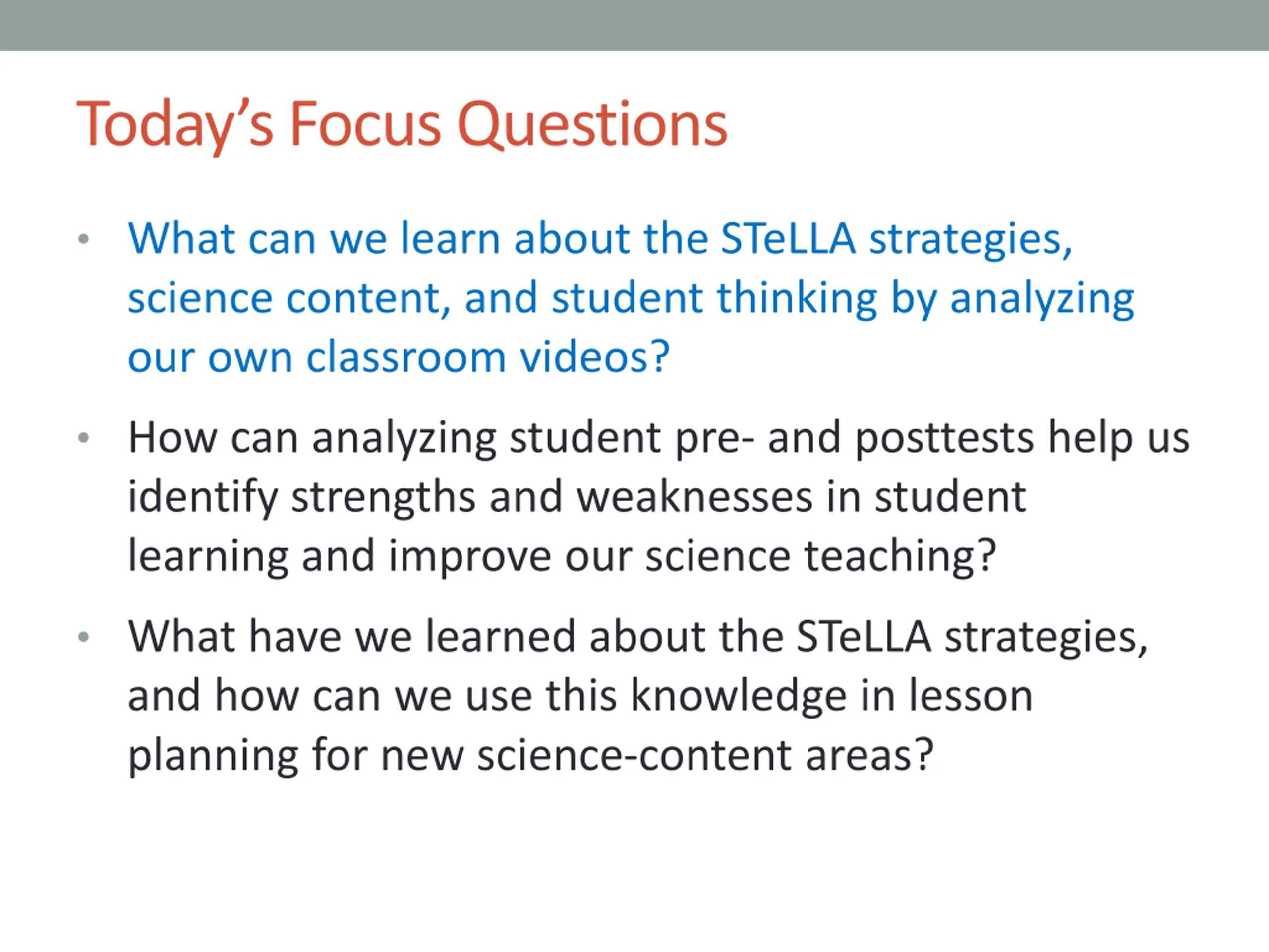 Todays Focus Questions What can we learn about the STeLLA strategies, science content, and student thinking by analyzing our own classroom videos? How can analyzing student pre- and posttests help us identify strengths and weaknesses in student learning and improve our science teaching? What have we learned about the STeLLA strategies, and how can we use this knowledge in lesson planning for new science-content areas?