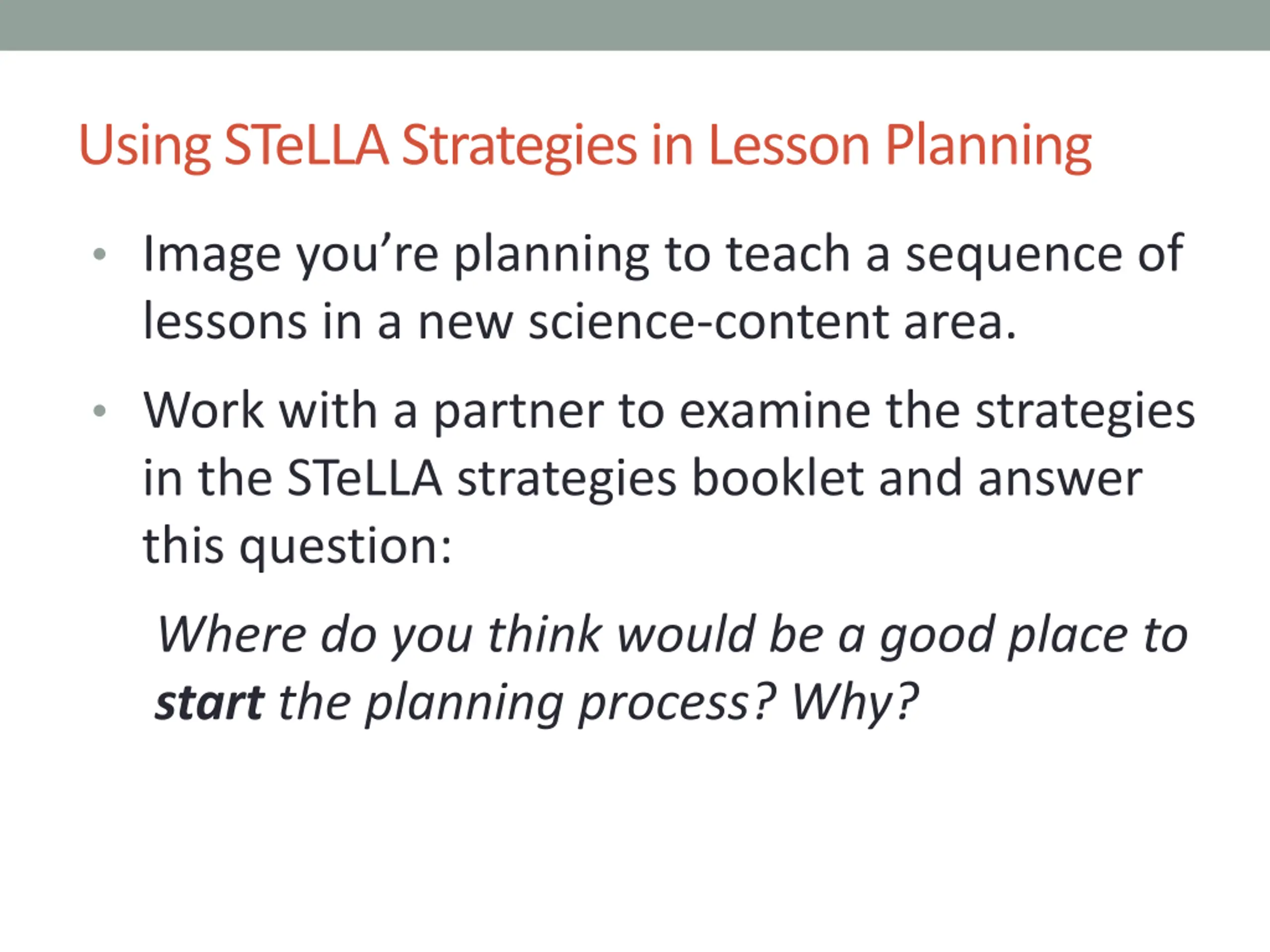 Using STeLLA Strategies in Lesson Planning Image you re planning to teach a sequence of lessons in a new science-content area. Work with a partner to examine the strategies in the STeLLA strategies booklet and answer this question: Where do you think would be a good place to start the planning process? Why?