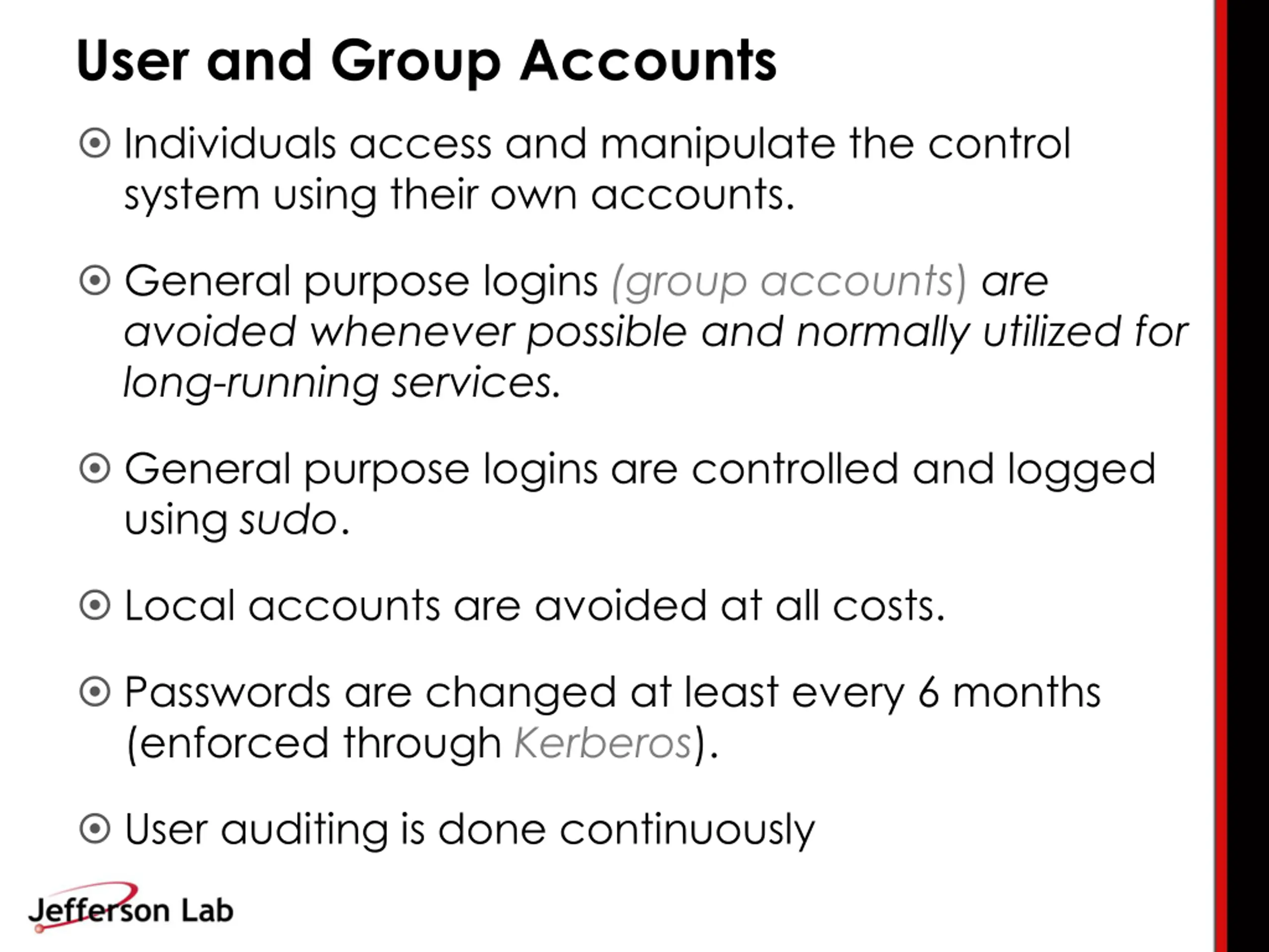 User and Group Accounts Individuals access and manipulate the control system using their own accounts. General purpose logins (group accounts) are avoided whenever possible and normally utilized for long-running services. General purpose logins are controlled and logged using sudo. Local accounts are avoided at all costs. Passwords are changed at least every 6 months (enforced through Kerberos). User auditing is done continuously