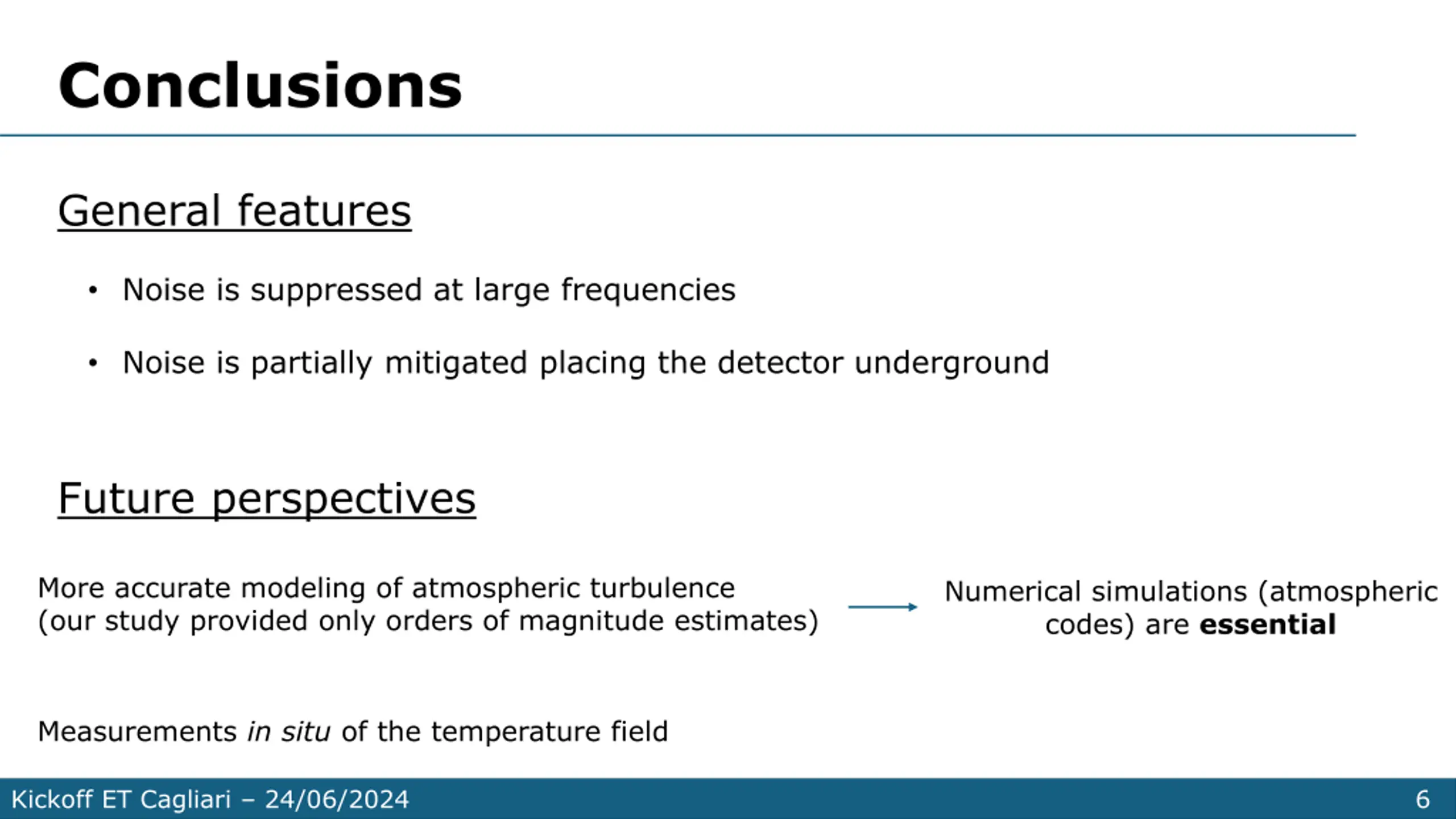 Conclusions General features Noise is suppressed at large frequencies Noise is partially mitigated placing the detector underground Future perspectives More accurate modeling of atmospheric turbulence (our study provided only orders of magnitude estimates) Numerical simulations (atmospheric codes) are essential Measurements in situ of the temperature field Kickoff ET Cagliari 24/06/2024 6