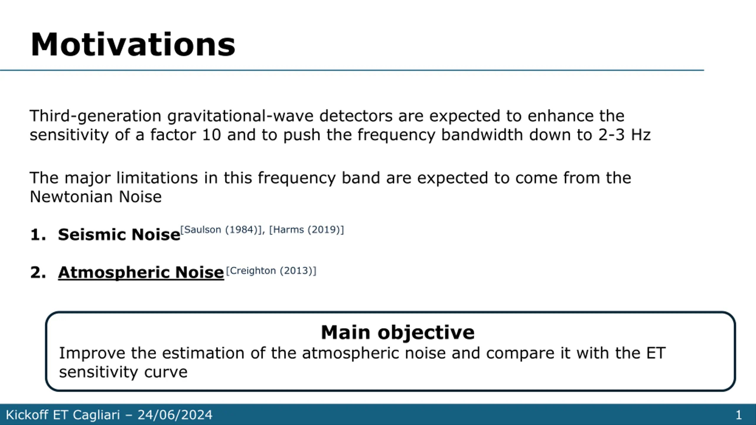 Motivations Third-generation gravitational-wave detectors are expected to enhance the sensitivity of a factor 10 and to push the frequency bandwidth down to 2-3 Hz The major limitations in this frequency band are expected to come from the Newtonian Noise [Saulson (1984)], [Harms (2019)] 1. Seismic Noise 2. Atmospheric Noise [Creighton (2013)] Main objective Improve the estimation of the atmospheric noise and compare it with the ET sensitivity curve Kickoff ET Cagliari 24/06/2024 1