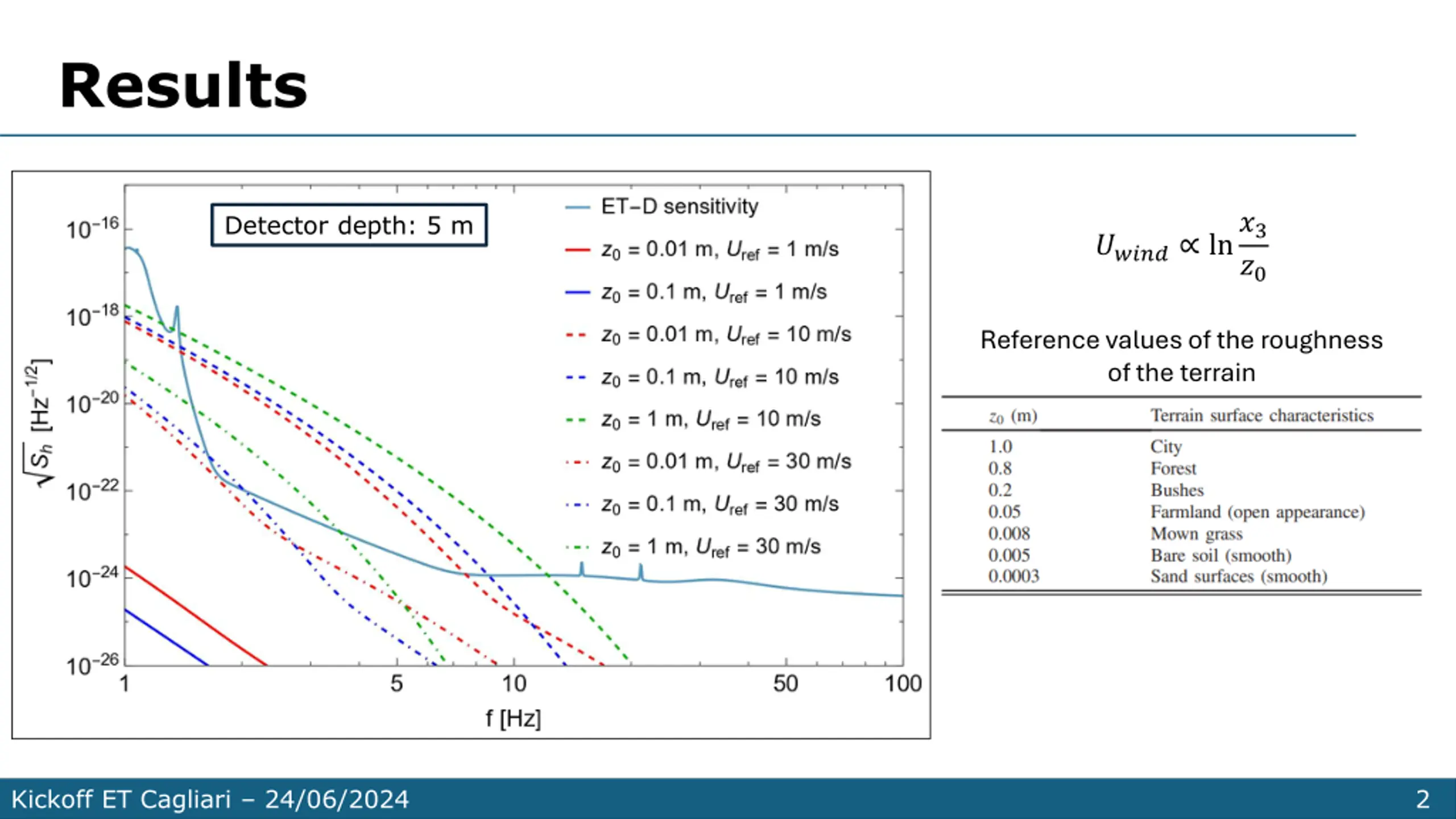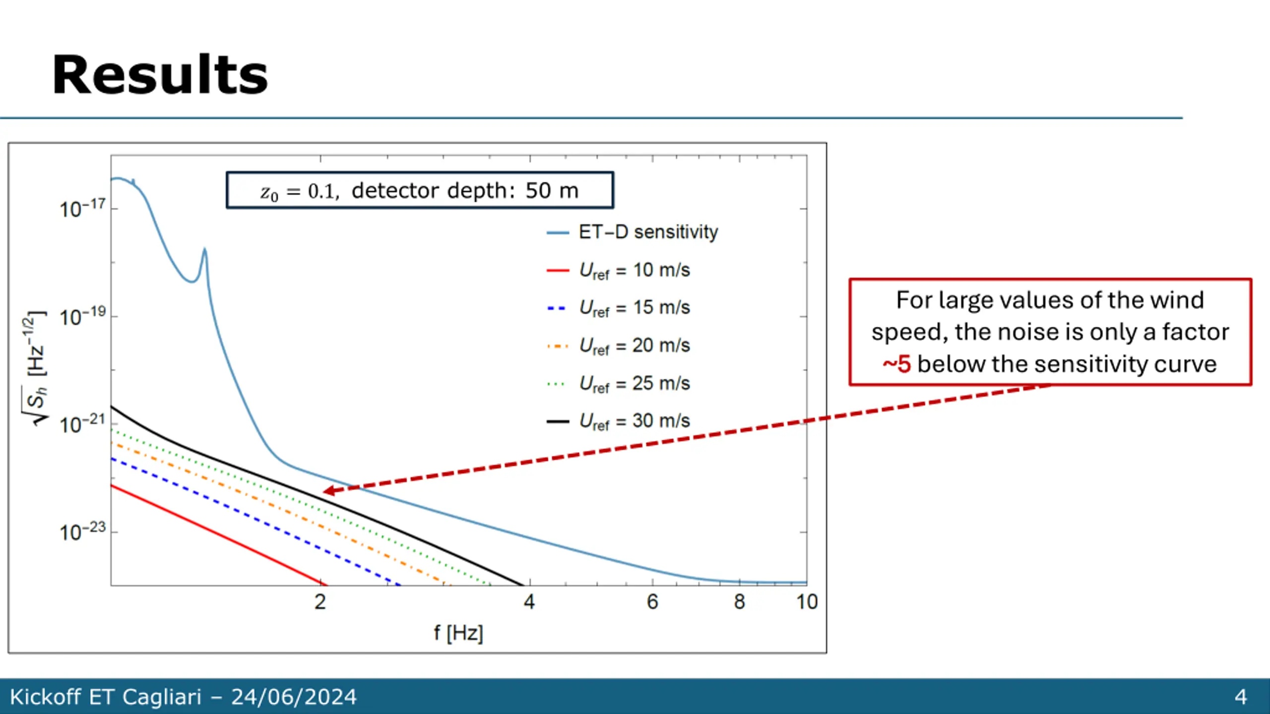 Results ?0= 0.1, detector depth: 50 m For large values of the wind speed, the noise is only a factor ~5 ~5 below the sensitivity curve Kickoff ET Cagliari 24/06/2024 4