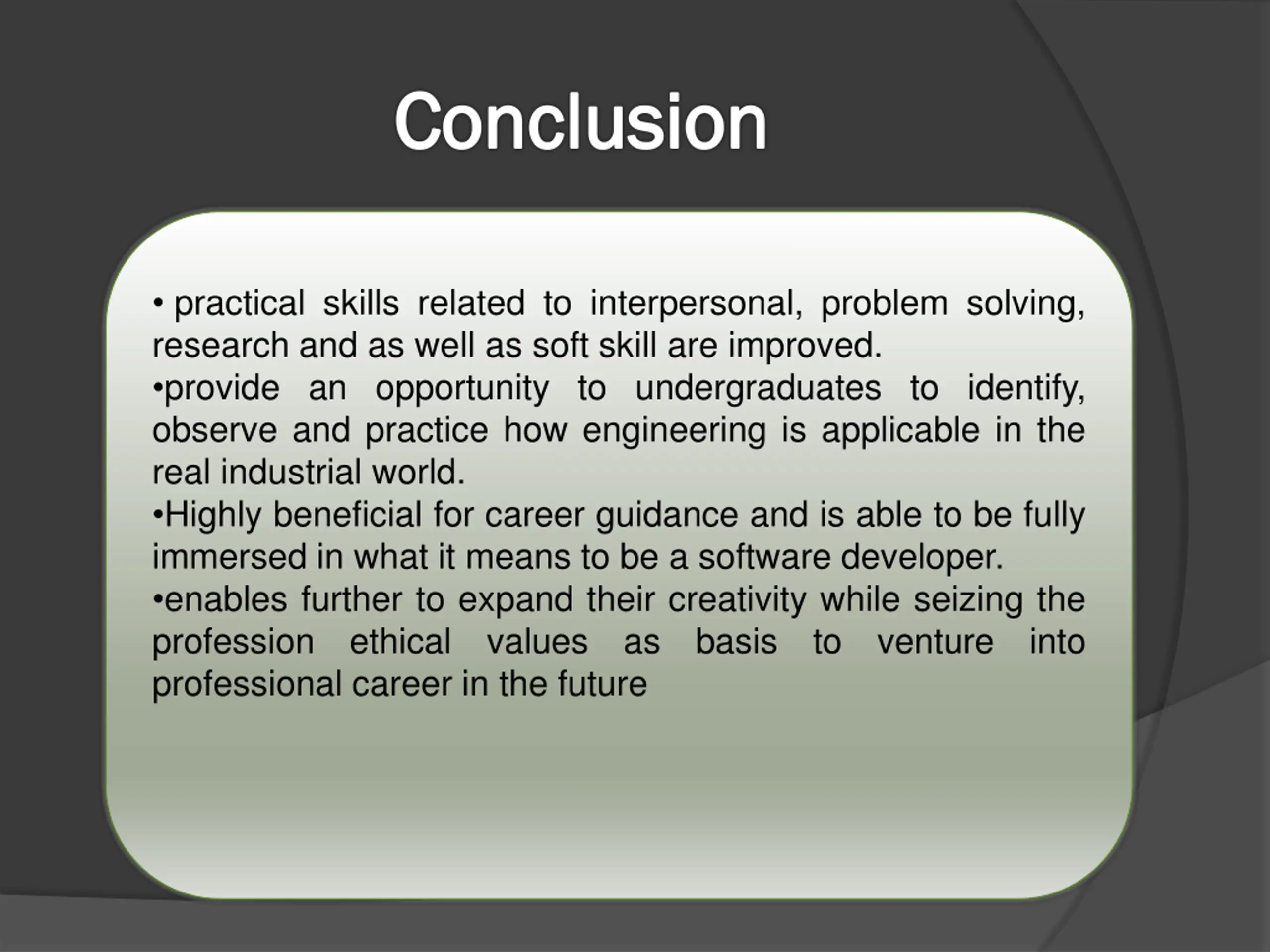 Conclusion practical skills related to interpersonal, problem solving, research and as well as soft skill are improved. provide an opportunity to undergraduates to identify, observe and practice how engineering is applicable in the real industrial world. Highly beneficial for career guidance and is able to be fully immersed in what it means to be a software developer. enables further to expand their creativity while seizing the profession ethical values as basis to venture into professional career in the future