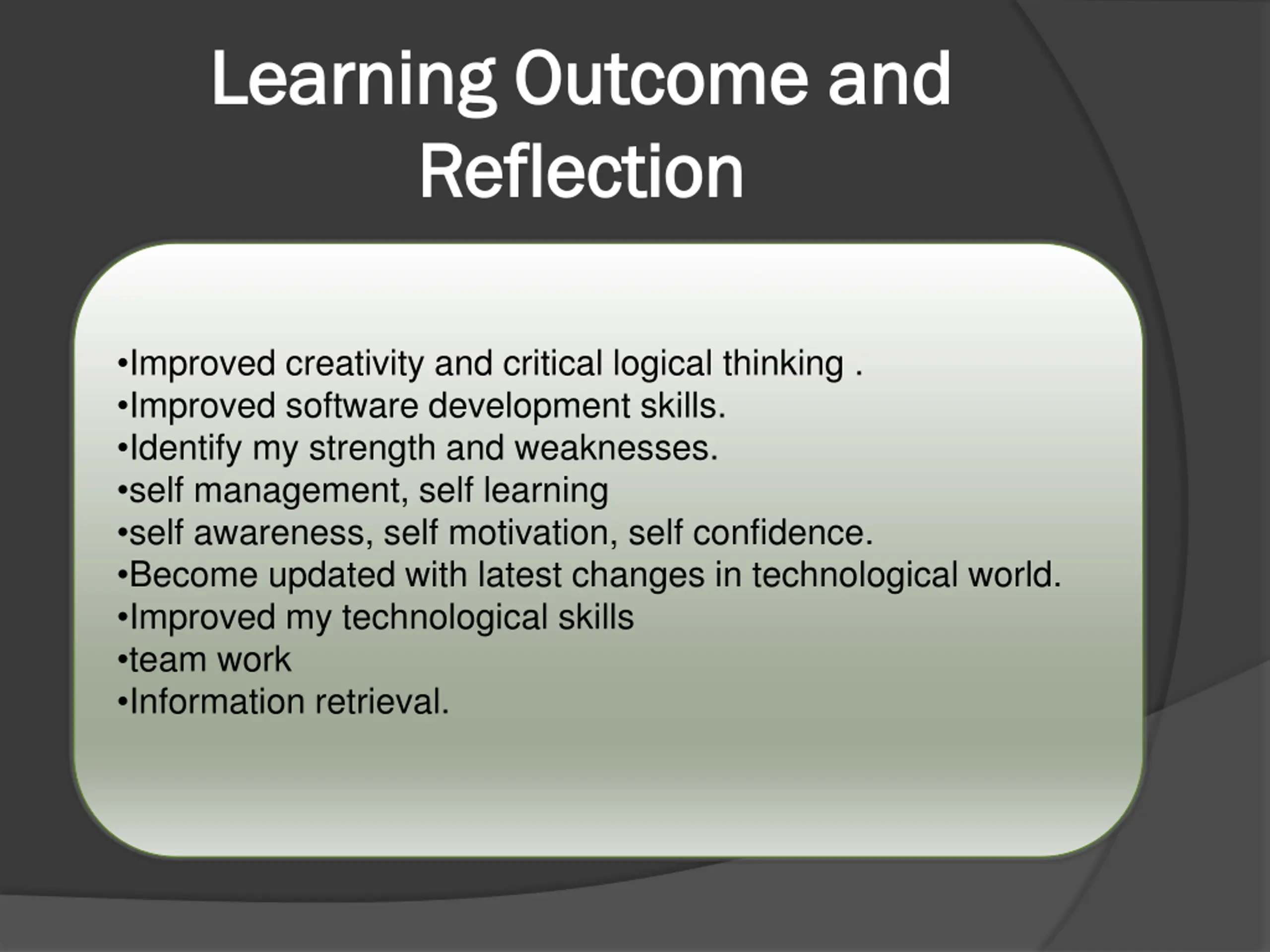 Learning Outcome and Learning Outcome and Reflection Reflection Improved creativity and critical logical thinking . Improved software development skills. Identify my strength and weaknesses. self management, self learning self awareness, self motivation, self confidence. Become updated with latest changes in technological world. Improved my technological skills team work Information retrieval.