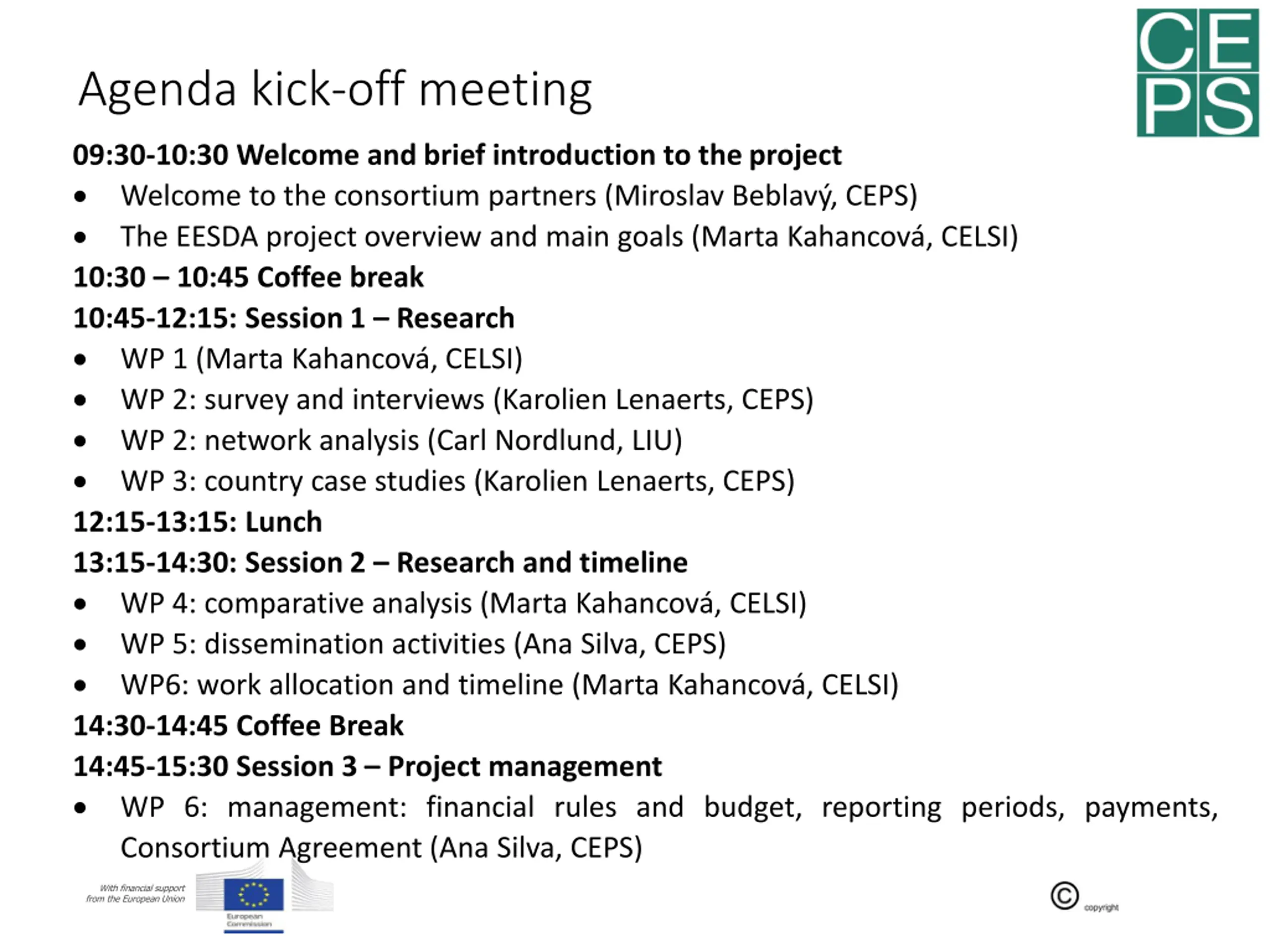 Agenda kick-off meeting 09:30-10:30 Welcome and brief introduction to the project Welcome to the consortium partners (Miroslav Beblav , CEPS) The EESDA project overview and main goals (Marta Kahancov , CELSI) 10:30 10:45 Coffee break 10:45-12:15: Session 1 Research WP 1 (Marta Kahancov , CELSI) WP 2: survey and interviews (Karolien Lenaerts, CEPS) WP 2: network analysis (Carl Nordlund, LIU) WP 3: country case studies (Karolien Lenaerts, CEPS) 12:15-13:15: Lunch 13:15-14:30: Session 2 Research and timeline WP 4: comparative analysis (Marta Kahancov , CELSI) WP 5: dissemination activities (Ana Silva, CEPS) WP6: work allocation and timeline (Marta Kahancov , CELSI) 14:30-14:45 Coffee Break 14:45-15:30 Session 3 Project management WP 6: management: financial rules and budget, reporting periods, payments, Consortium Agreement (Ana Silva, CEPS) With financial support from the European Union