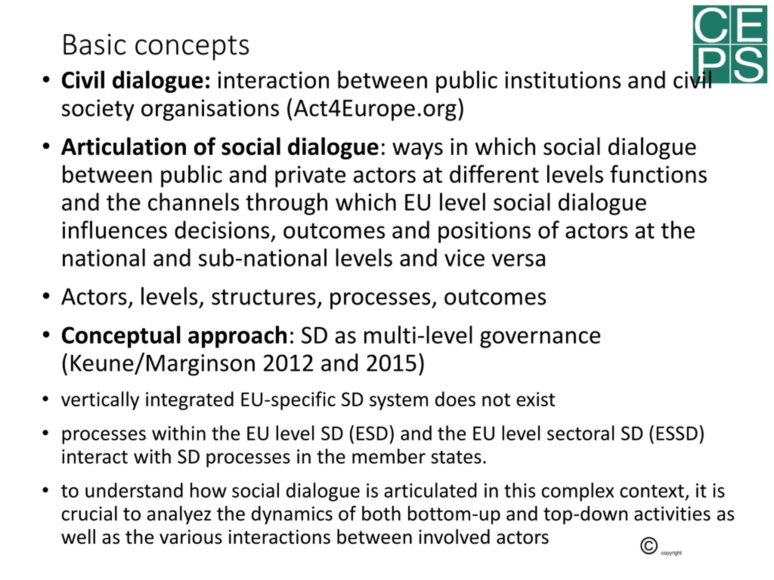 Basic concepts Civil dialogue: interaction between public institutions and civil society organisations (Act4Europe.org) Articulation of social dialogue: ways in which social dialogue between public and private actors at different levels functions and the channels through which EU level social dialogue influences decisions, outcomes and positions of actors at the national and sub-national levels and vice versa Actors, levels, structures, processes, outcomes Conceptual approach: SD as multi-level governance (Keune/Marginson 2012 and 2015) vertically integrated EU-specific SD system does not exist processes within the EU level SD (ESD) and the EU level sectoral SD (ESSD) interact with SD processes in the member states. to understand how social dialogue is articulated in this complex context, it is crucial to analyez the dynamics of both bottom-up and top-down activities as well as the various interactions between involved actors