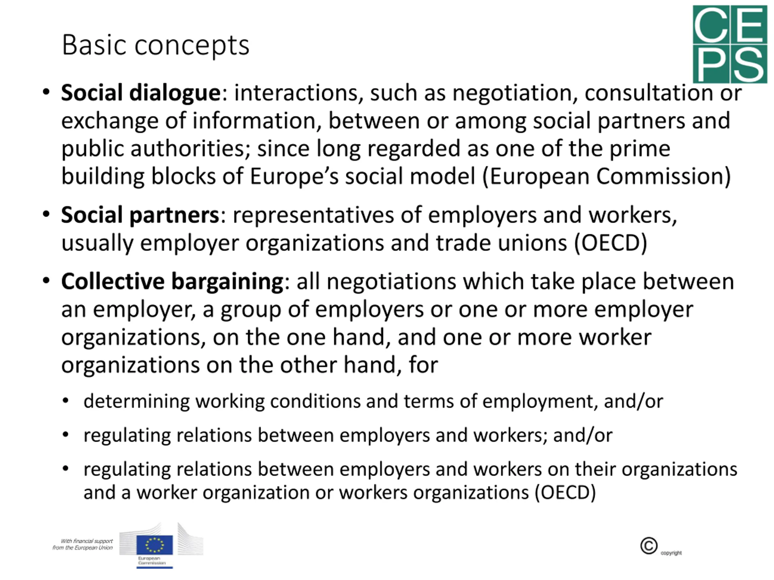Basic concepts Social dialogue: interactions, such as negotiation, consultation or exchange of information, between or among social partners and public authorities; since long regarded as one of the prime building blocks of Europe s social model (European Commission) Social partners: representatives of employers and workers, usually employer organizations and trade unions (OECD) Collective bargaining: all negotiations which take place between an employer, a group of employers or one or more employer organizations, on the one hand, and one or more worker organizations on the other hand, for determining working conditions and terms of employment, and/or regulating relations between employers and workers; and/or regulating relations between employers and workers on their organizations and a worker organization or workers organizations (OECD) With financial support from the European Union