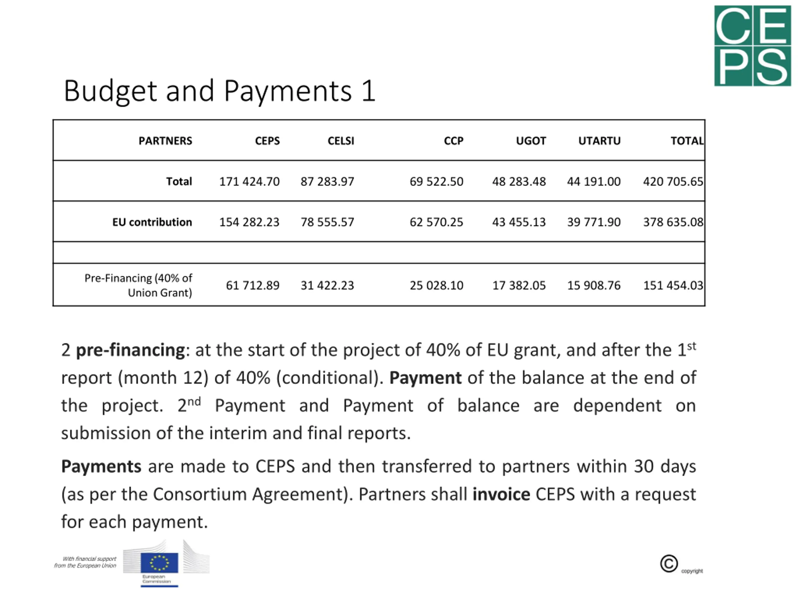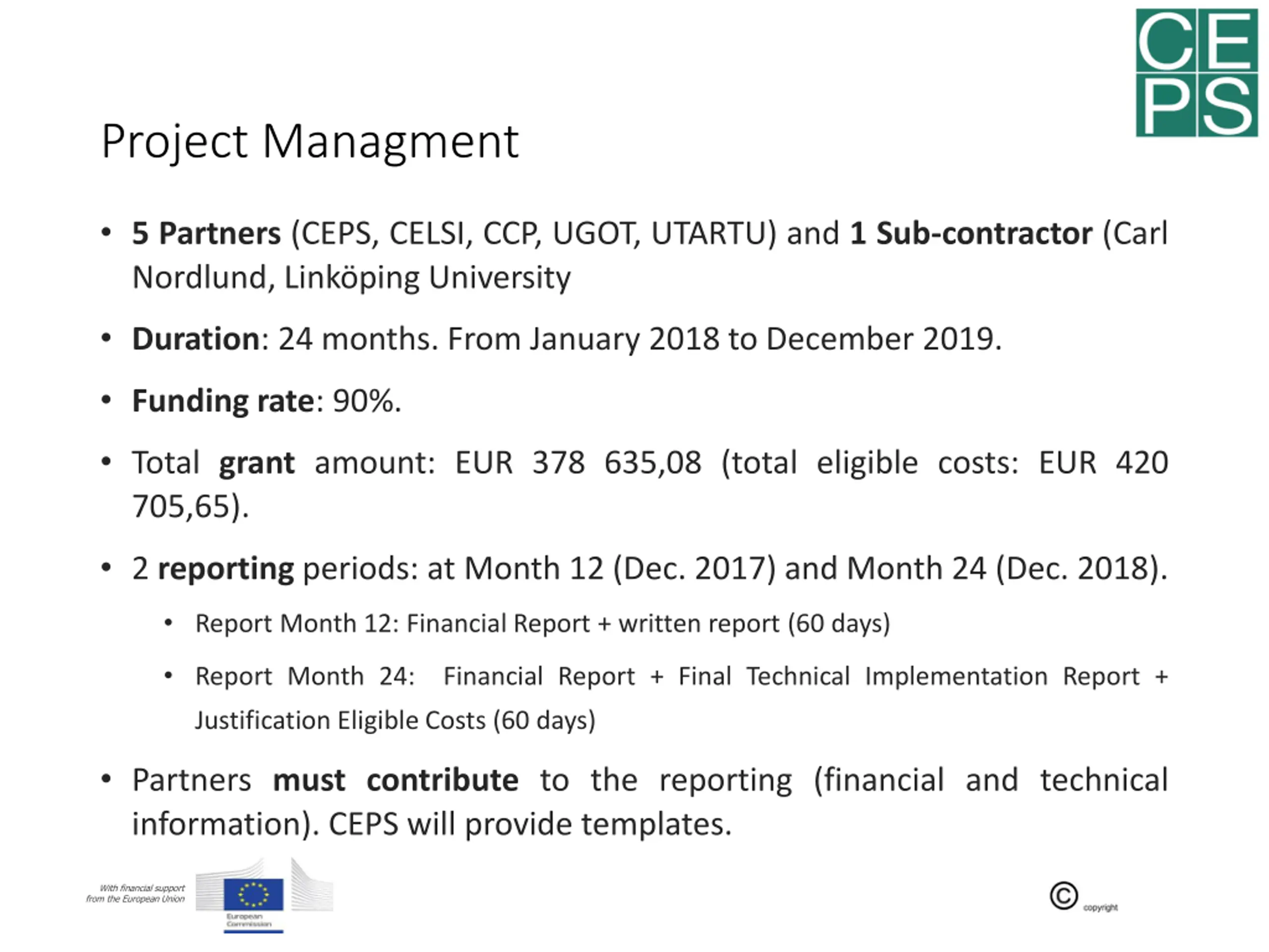 Project Managment 5 Partners (CEPS, CELSI, CCP, UGOT, UTARTU) and 1 Sub-contractor (Carl Nordlund, Link ping University Duration: 24 months. From January 2018 to December 2019. Funding rate: 90%. Total grant amount: EUR 378 635,08 (total eligible costs: EUR 420 705,65). 2 reporting periods: at Month 12 (Dec. 2017) and Month 24 (Dec. 2018). Report Month 12: Financial Report + written report (60 days) Report Month 24: Financial Report + Final Technical Implementation Report + Justification Eligible Costs (60 days) Partners must contribute to the reporting (financial and technical information). CEPS will provide templates. With financial support from the European Union