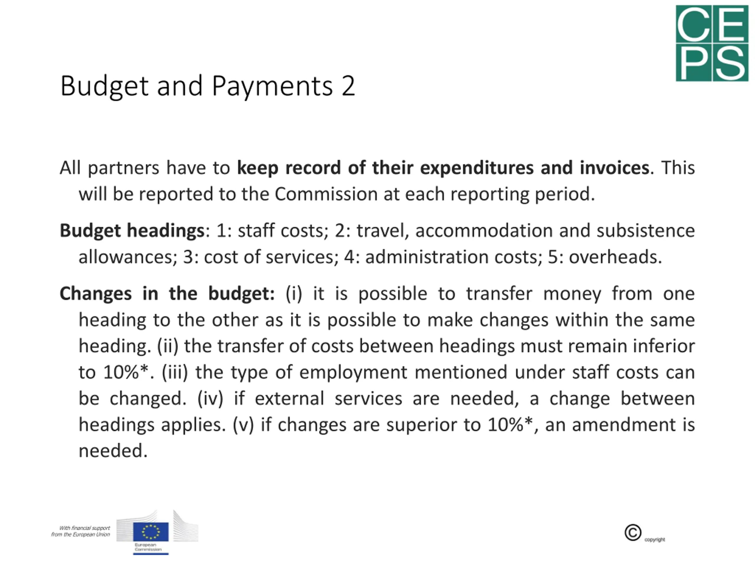 Budget and Payments 2 All partners have to keep record of their expenditures and invoices. This will be reported to the Commission at each reporting period. Budget headings: 1: staff costs; 2: travel, accommodation and subsistence allowances; 3: cost of services; 4: administration costs; 5: overheads. Changes in the budget: (i) it is possible to transfer money from one heading to the other as it is possible to make changes within the same heading. (ii) the transfer of costs between headings must remain inferior to 10%*. (iii) the type of employment mentioned under staff costs can be changed. (iv) if external services are needed, a change between headings applies. (v) if changes are superior to 10%*, an amendment is needed. With financial support from the European Union