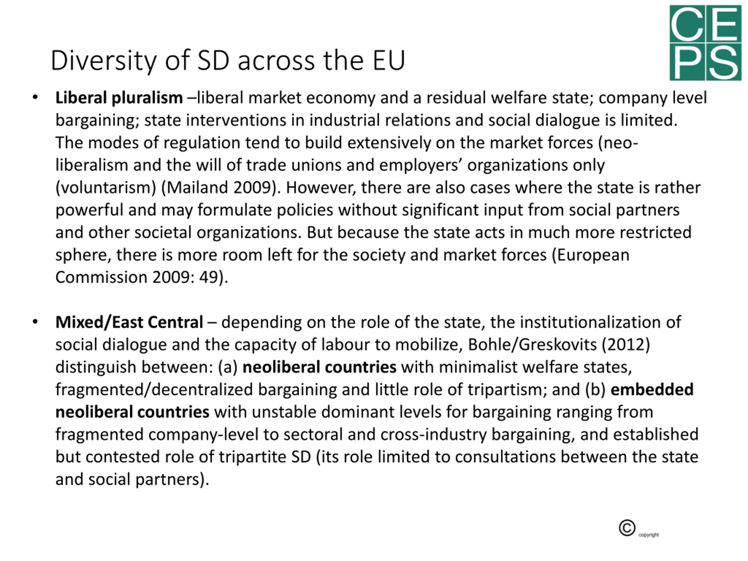 Diversity of SD across the EU Liberal pluralism liberal market economy and a residual welfare state; company level bargaining; state interventions in industrial relations and social dialogue is limited. The modes of regulation tend to build extensively on the market forces (neo- liberalism and the will of trade unions and employers organizations only (voluntarism) (Mailand 2009). However, there are also cases where the state is rather powerful and may formulate policies without significant input from social partners and other societal organizations. But because the state acts in much more restricted sphere, there is more room left for the society and market forces (European Commission 2009: 49). Mixed/East Central depending on the role of the state, the institutionalization of social dialogue and the capacity of labour to mobilize, Bohle/Greskovits (2012) distinguish between: (a) neoliberal countries with minimalist welfare states, fragmented/decentralized bargaining and little role of tripartism; and (b) embedded neoliberal countries with unstable dominant levels for bargaining ranging from fragmented company-level to sectoral and cross-industry bargaining, and established but contested role of tripartite SD (its role limited to consultations between the state and social partners).