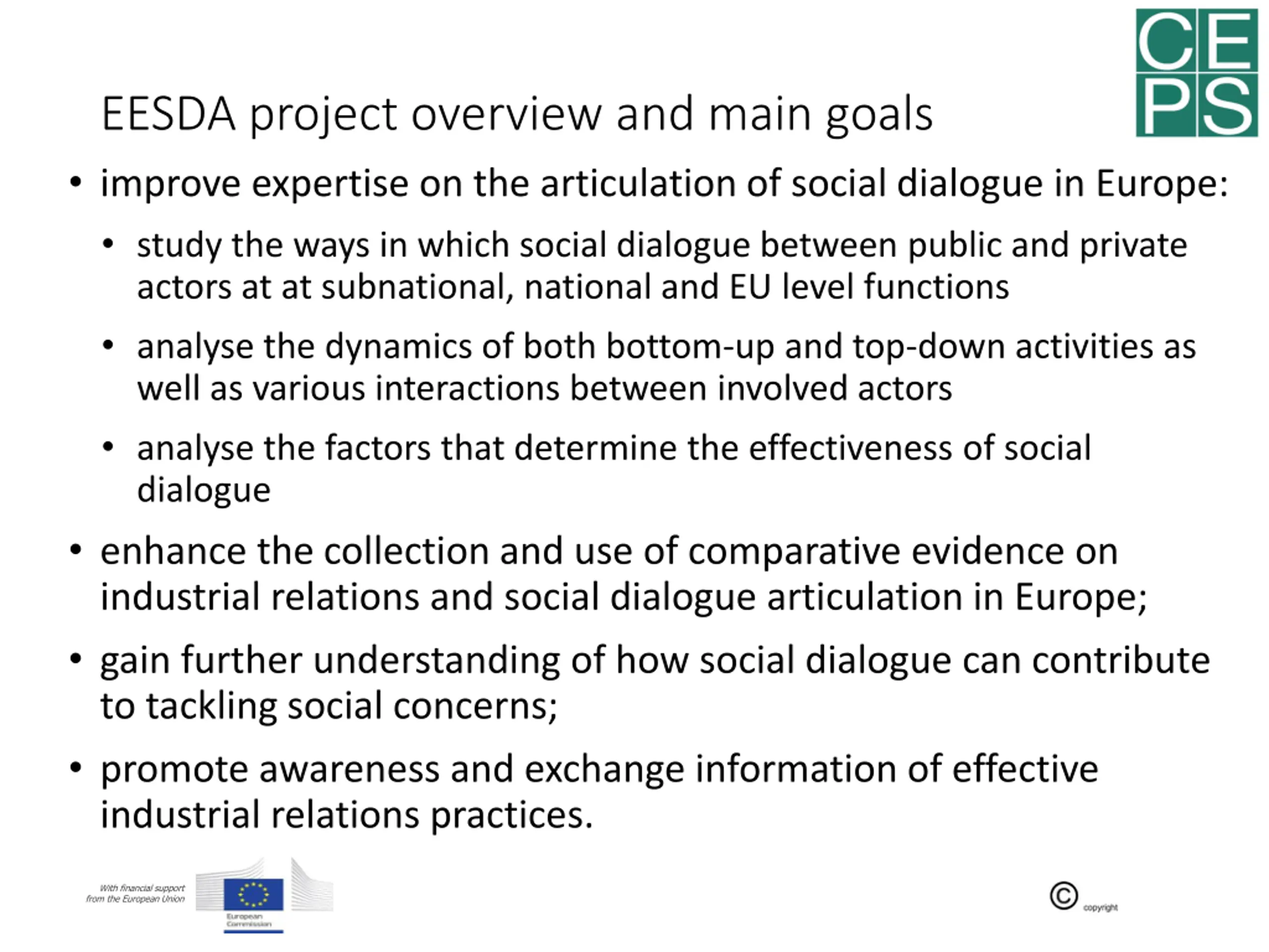 EESDA project overview and main goals improve expertise on the articulation of social dialogue in Europe: study the ways in which social dialogue between public and private actors at at subnational, national and EU level functions analyse the dynamics of both bottom-up and top-down activities as well as various interactions between involved actors analyse the factors that determine the effectiveness of social dialogue enhance the collection and use of comparative evidence on industrial relations and social dialogue articulation in Europe; gain further understanding of how social dialogue can contribute to tackling social concerns; promote awareness and exchange information of effective industrial relations practices. With financial support from the European Union