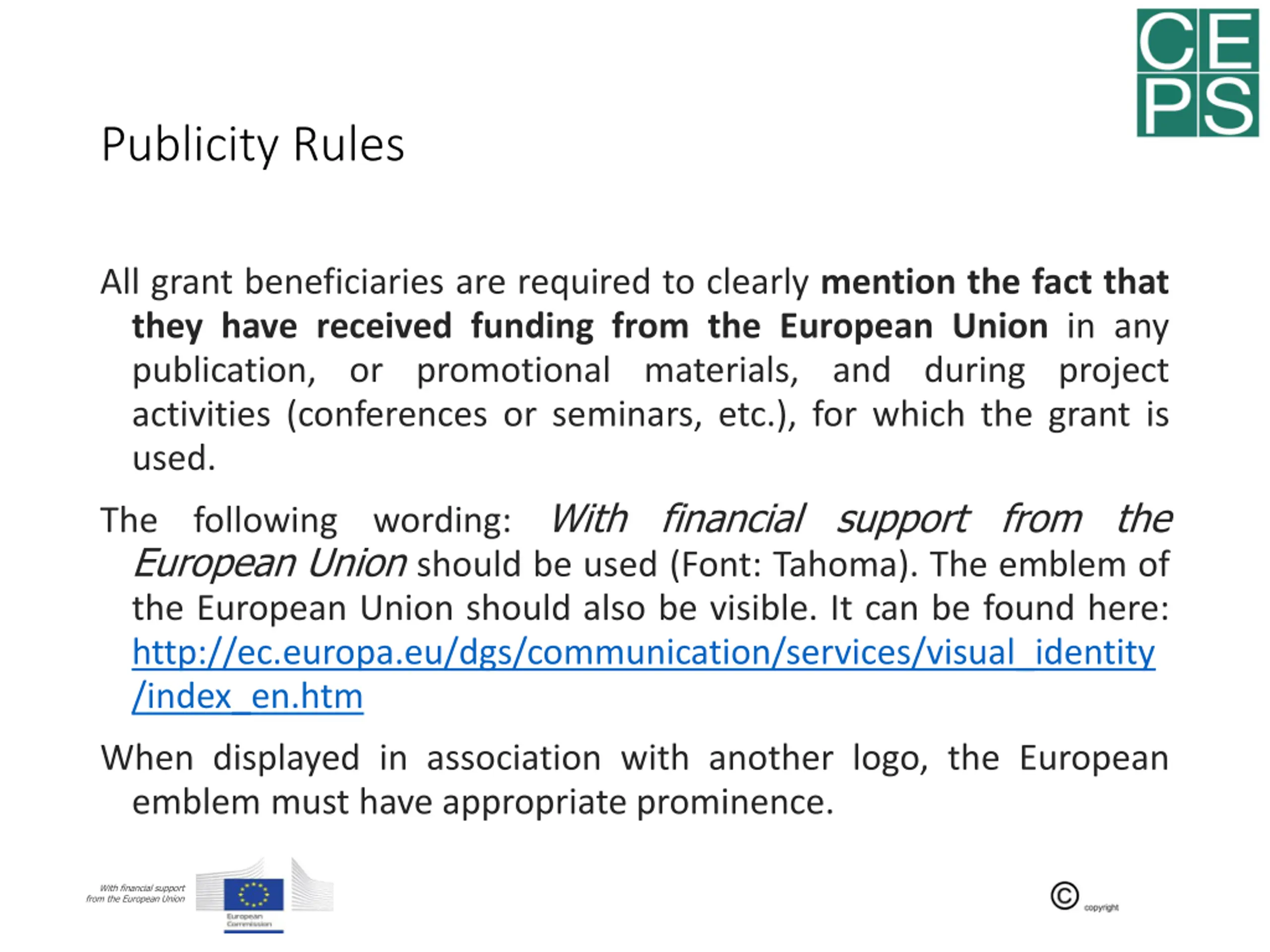 Publicity Rules All grant beneficiaries are required to clearly mention the fact that they have received funding from the European Union in any publication, or promotional materials, and during project activities (conferences or seminars, etc.), for which the grant is used. The following wording: With financial support from the European Union should be used (Font: Tahoma). The emblem of the European Union should also be visible. It can be found here: http://ec.europa.eu/dgs/communication/services/visual_identity /index_en.htm When displayed in association with another logo, the European emblem must have appropriate prominence. With financial support from the European Union