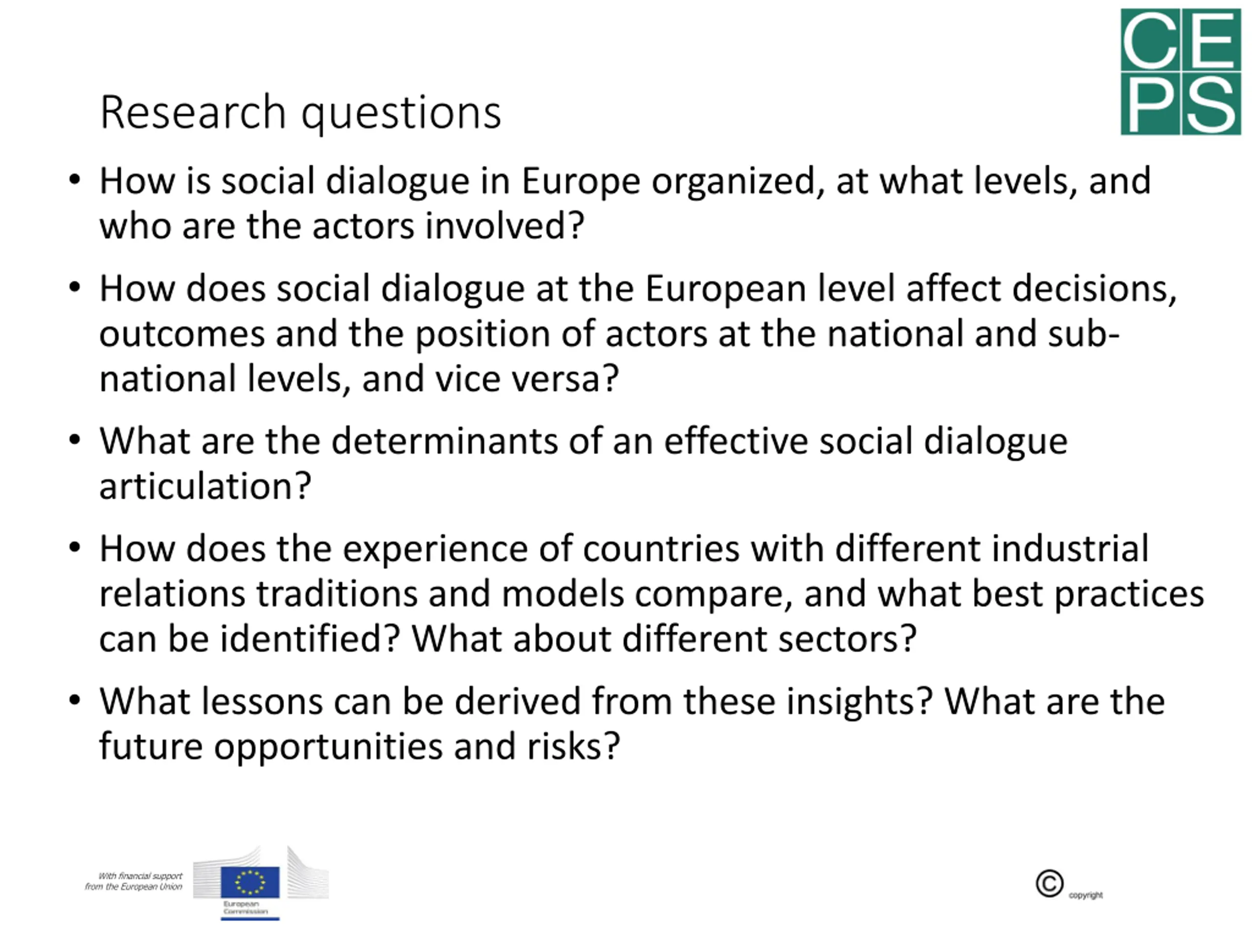 Research questions How is social dialogue in Europe organized, at what levels, and who are the actors involved? How does social dialogue at the European level affect decisions, outcomes and the position of actors at the national and sub- national levels, and vice versa? What are the determinants of an effective social dialogue articulation? How does the experience of countries with different industrial relations traditions and models compare, and what best practices can be identified? What about different sectors? What lessons can be derived from these insights? What are the future opportunities and risks? With financial support from the European Union