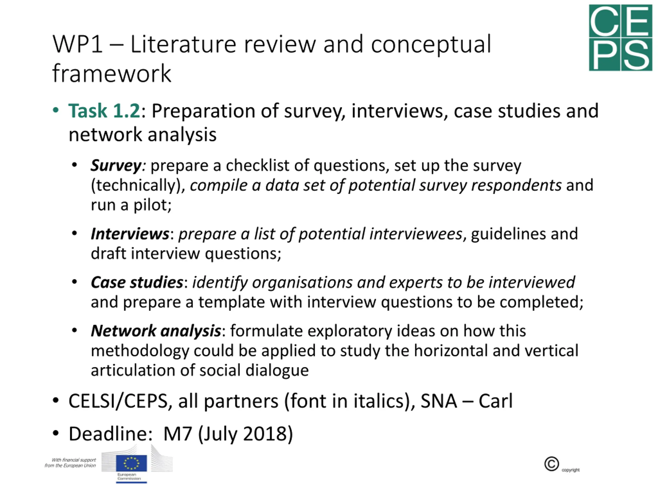 WP1 Literature review and conceptual framework Task 1.2: Preparation of survey, interviews, case studies and network analysis Survey: prepare a checklist of questions, set up the survey (technically), compile a data set of potential survey respondents and run a pilot; Interviews: prepare a list of potential interviewees, guidelines and draft interview questions; Case studies: identify organisations and experts to be interviewed and prepare a template with interview questions to be completed; Network analysis: formulate exploratory ideas on how this methodology could be applied to study the horizontal and vertical articulation of social dialogue CELSI/CEPS, all partners (font in italics), SNA Carl Deadline: M7 (July 2018) With financial support from the European Union