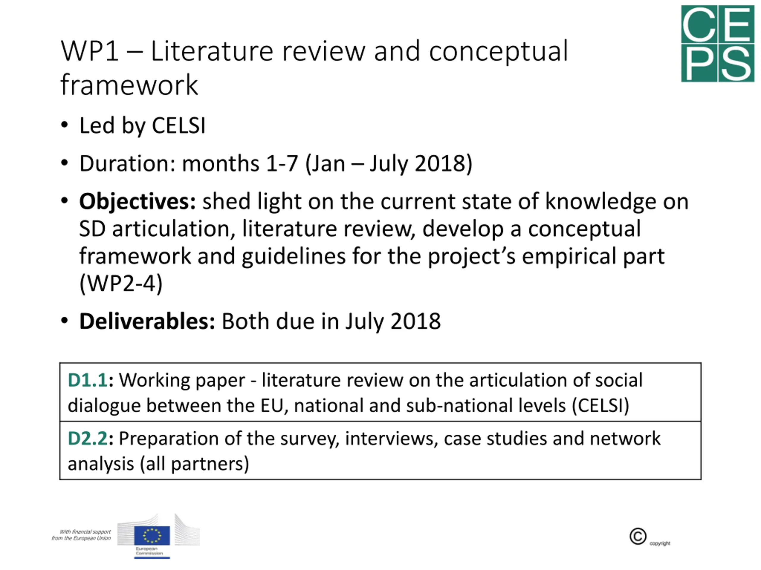 WP1 Literature review and conceptual framework Led by CELSI Duration: months 1-7 (Jan July 2018) Objectives: shed light on the current state of knowledge on SD articulation, literature review, develop a conceptual framework and guidelines for the project s empirical part (WP2-4) Deliverables: Both due in July 2018 D1.1: Working paper - literature review on the articulation of social dialogue between the EU, national and sub-national levels (CELSI) D2.2: Preparation of the survey, interviews, case studies and network analysis (all partners) With financial support from the European Union