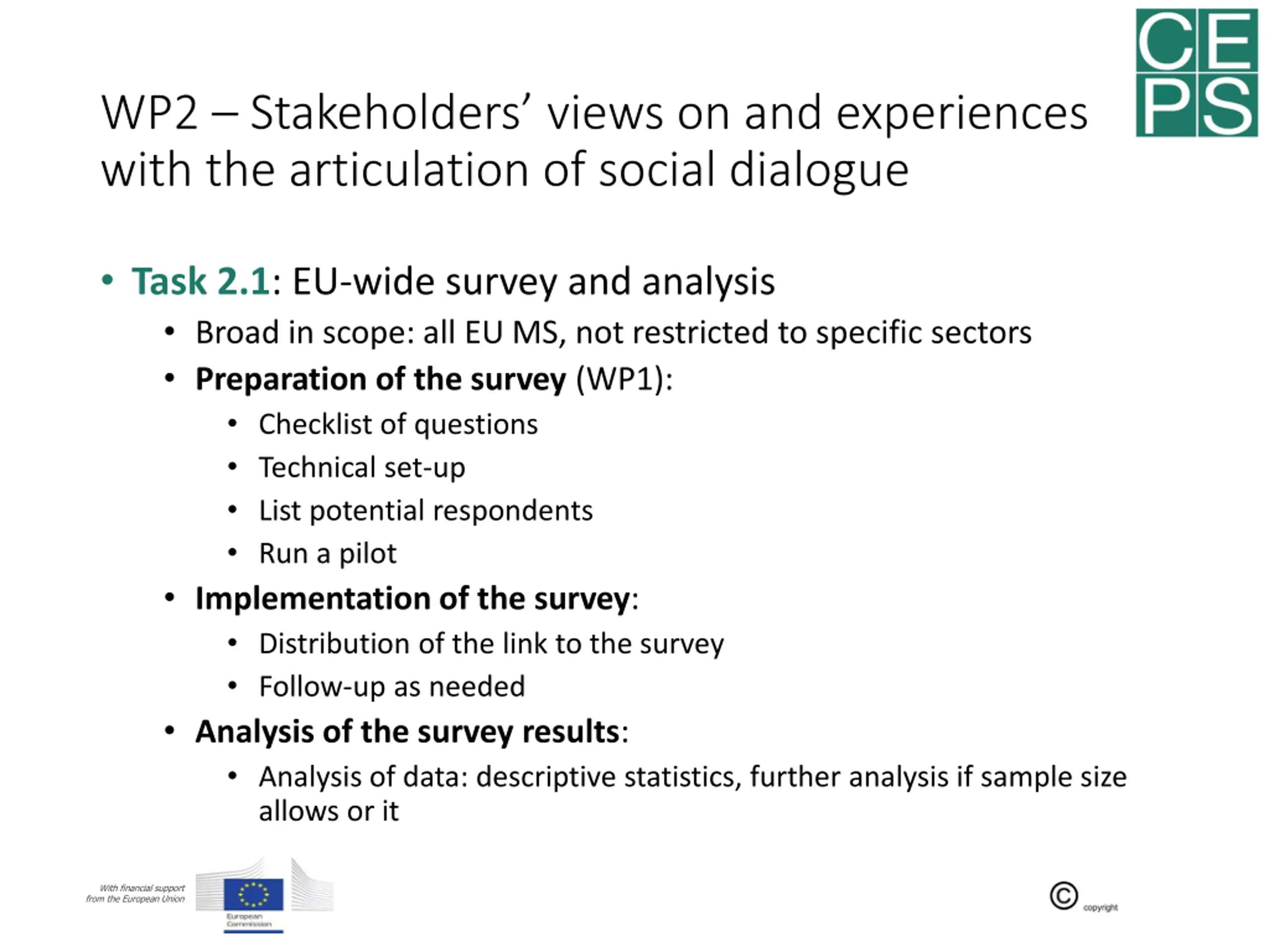 WP2 Stakeholders views on and experiences with the articulation of social dialogue Task 2.1: EU-wide survey and analysis Broad in scope: all EU MS, not restricted to specific sectors Preparation of the survey (WP1): Checklist of questions Technical set-up List potential respondents Run a pilot Implementation of the survey: Distribution of the link to the survey Follow-up as needed Analysis of the survey results: Analysis of data: descriptive statistics, further analysis if sample size allows or it With financial support from the European Union