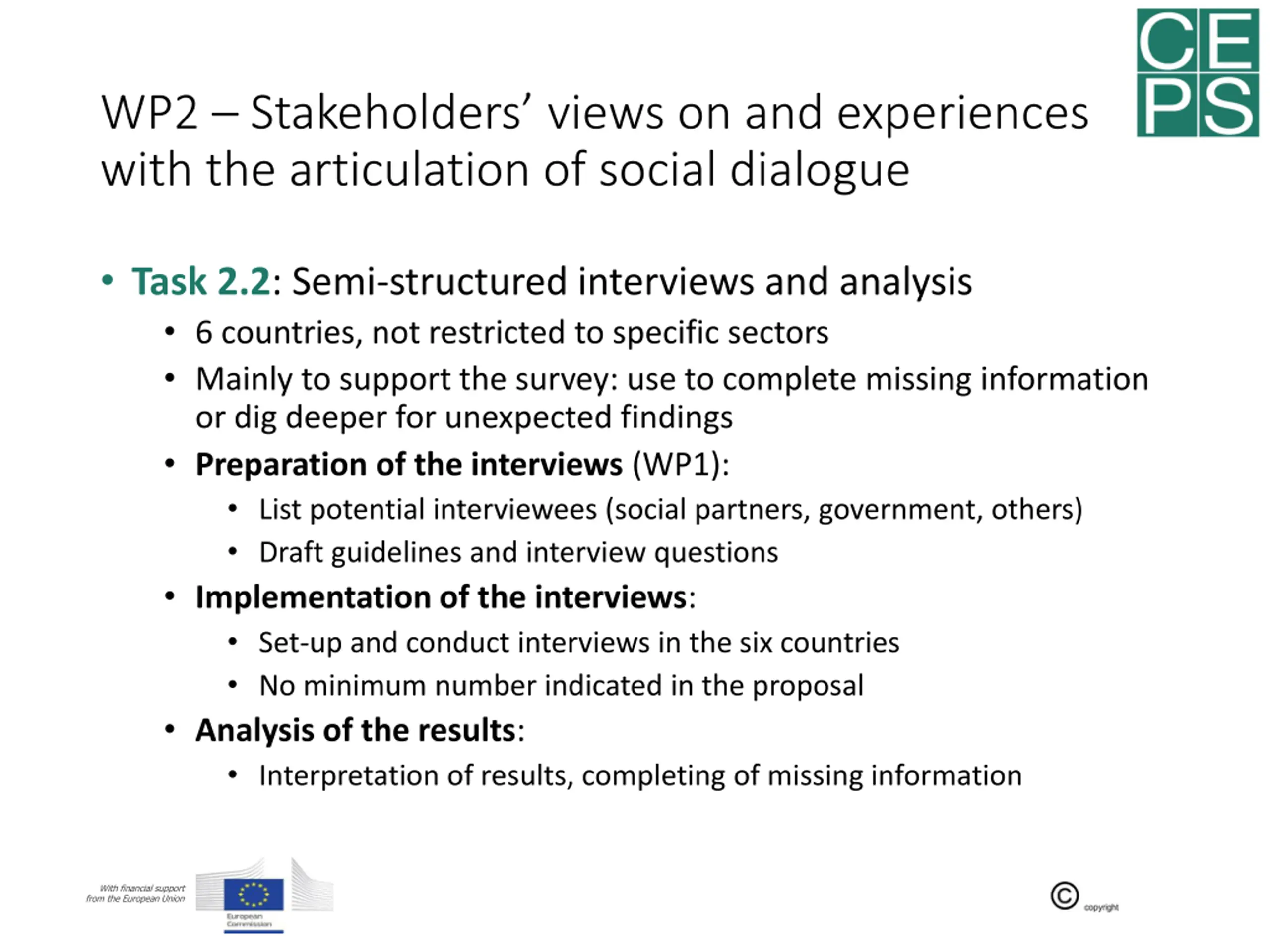 WP2 Stakeholders views on and experiences with the articulation of social dialogue Task 2.2: Semi-structured interviews and analysis 6 countries, not restricted to specific sectors Mainly to support the survey: use to complete missing information or dig deeper for unexpected findings Preparation of the interviews (WP1): List potential interviewees (social partners, government, others) Draft guidelines and interview questions Implementation of the interviews: Set-up and conduct interviews in the six countries No minimum number indicated in the proposal Analysis of the results: Interpretation of results, completing of missing information With financial support from the European Union