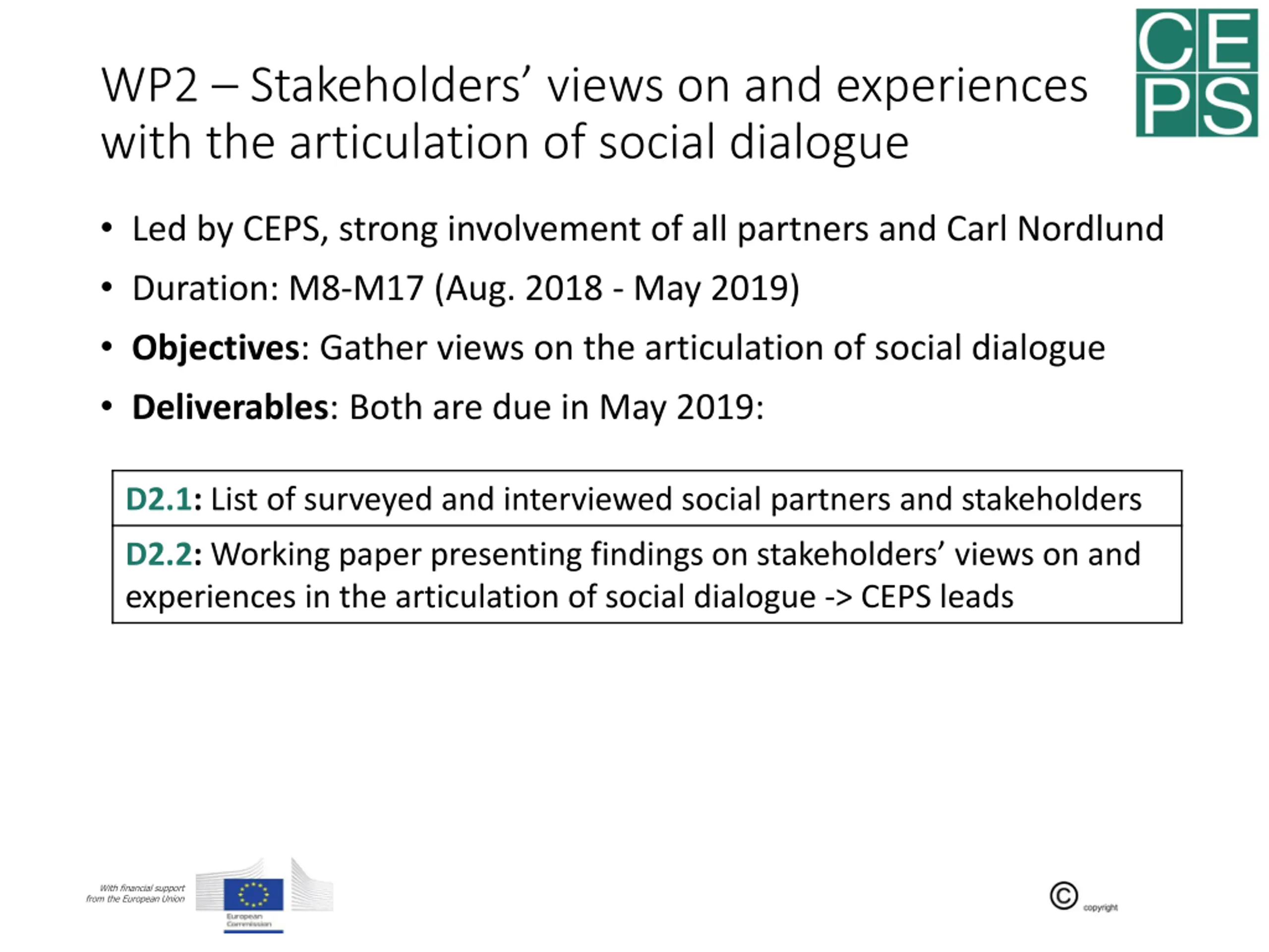 WP2 Stakeholders views on and experiences with the articulation of social dialogue Led by CEPS, strong involvement of all partners and Carl Nordlund Duration: M8-M17 (Aug. 2018 - May 2019) Objectives: Gather views on the articulation of social dialogue Deliverables: Both are due in May 2019: D2.1: List of surveyed and interviewed social partners and stakeholders D2.2: Working paper presenting findings on stakeholders views on and experiences in the articulation of social dialogue -> CEPS leads With financial support from the European Union