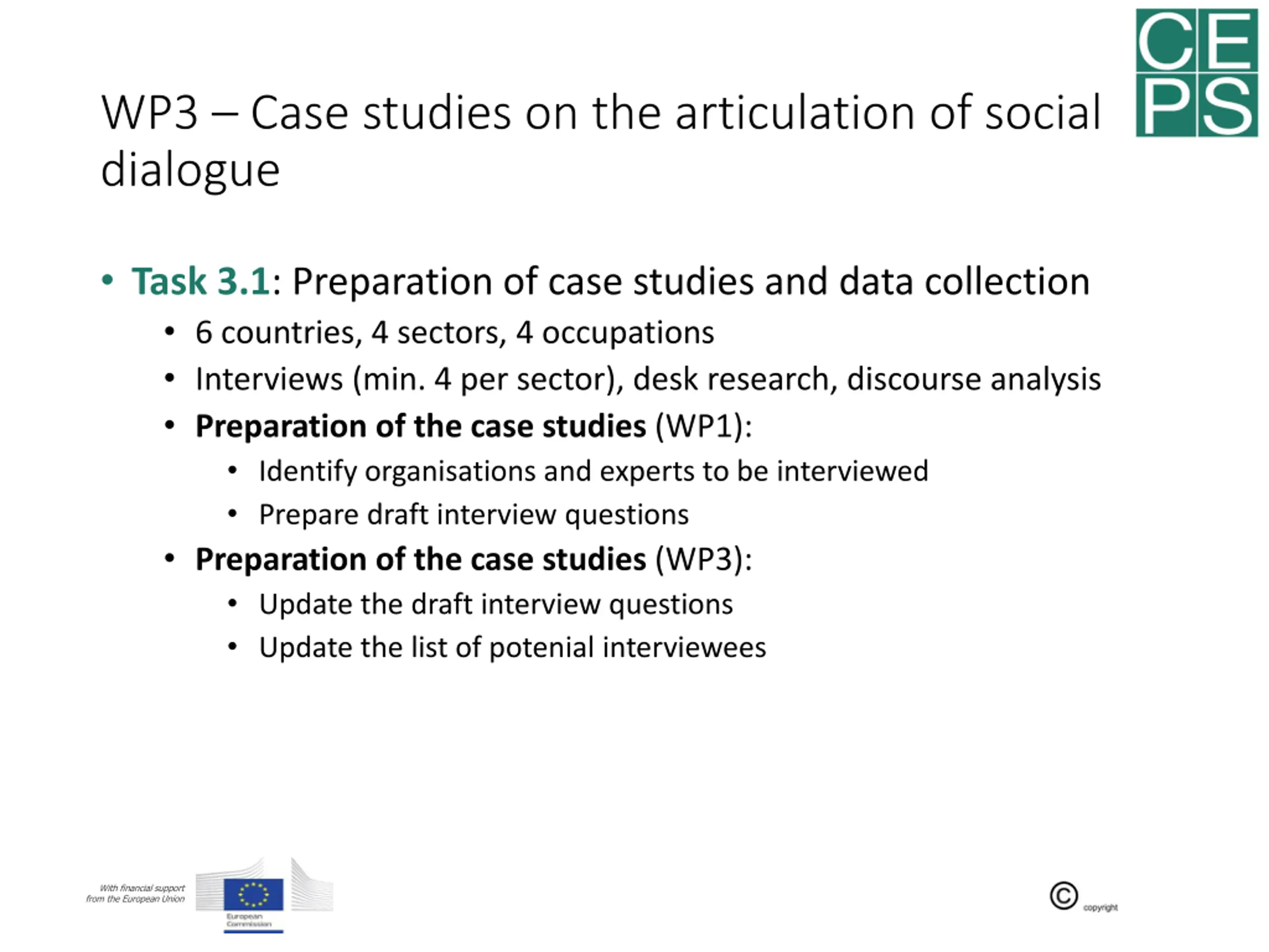 WP3 Case studies on the articulation of social dialogue Task 3.1: Preparation of case studies and data collection 6 countries, 4 sectors, 4 occupations Interviews (min. 4 per sector), desk research, discourse analysis Preparation of the case studies (WP1): Identify organisations and experts to be interviewed Prepare draft interview questions Preparation of the case studies (WP3): Update the draft interview questions Update the list of potenial interviewees With financial support from the European Union