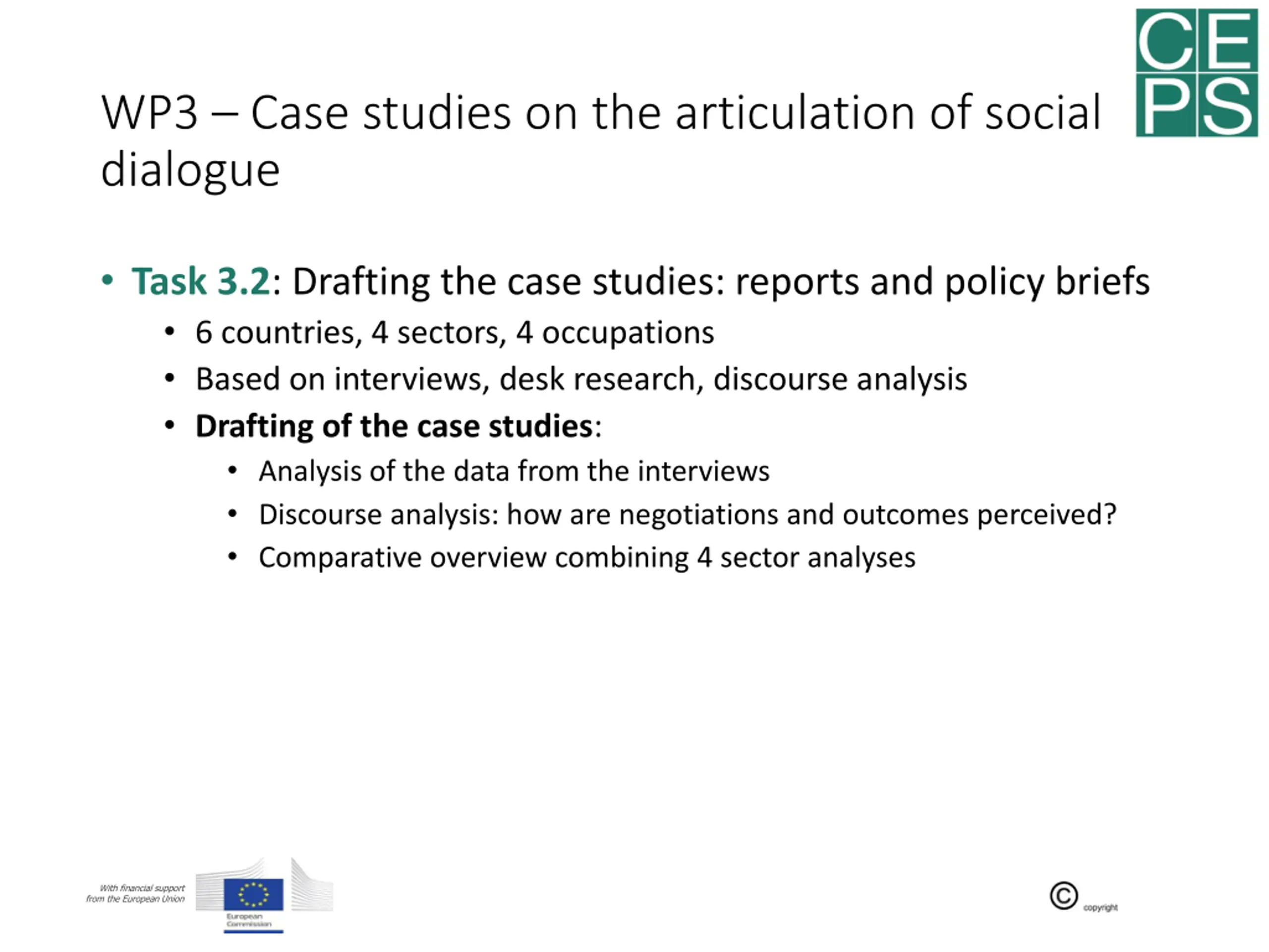WP3 Case studies on the articulation of social dialogue Task 3.2: Drafting the case studies: reports and policy briefs 6 countries, 4 sectors, 4 occupations Based on interviews, desk research, discourse analysis Drafting of the case studies: Analysis of the data from the interviews Discourse analysis: how are negotiations and outcomes perceived? Comparative overview combining 4 sector analyses With financial support from the European Union