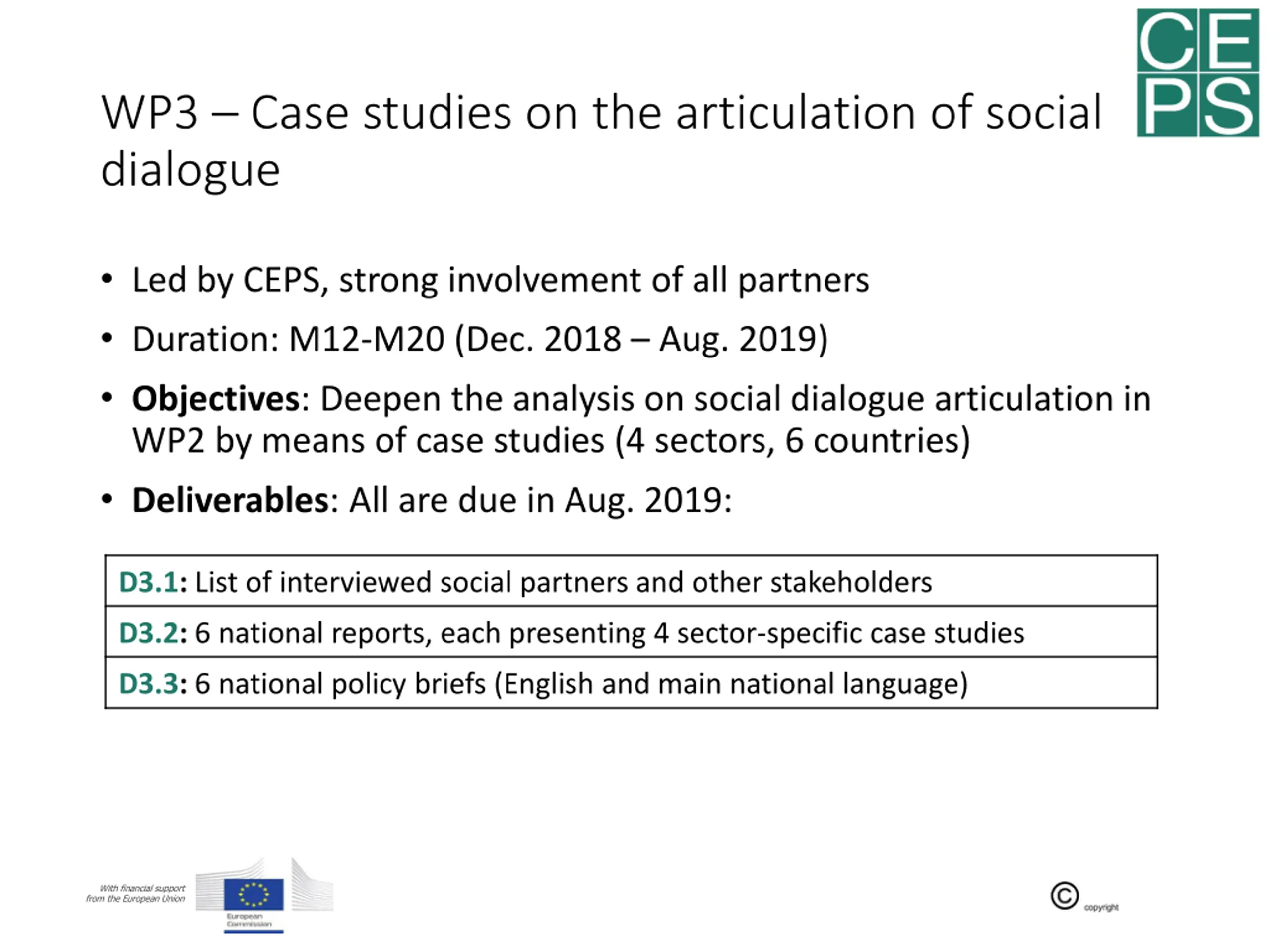 WP3 Case studies on the articulation of social dialogue Led by CEPS, strong involvement of all partners Duration: M12-M20 (Dec. 2018 Aug. 2019) Objectives: Deepen the analysis on social dialogue articulation in WP2 by means of case studies (4 sectors, 6 countries) Deliverables: All are due in Aug. 2019: D3.1: List of interviewed social partners and other stakeholders D3.2: 6 national reports, each presenting 4 sector-specific case studies D3.3: 6 national policy briefs (English and main national language) With financial support from the European Union