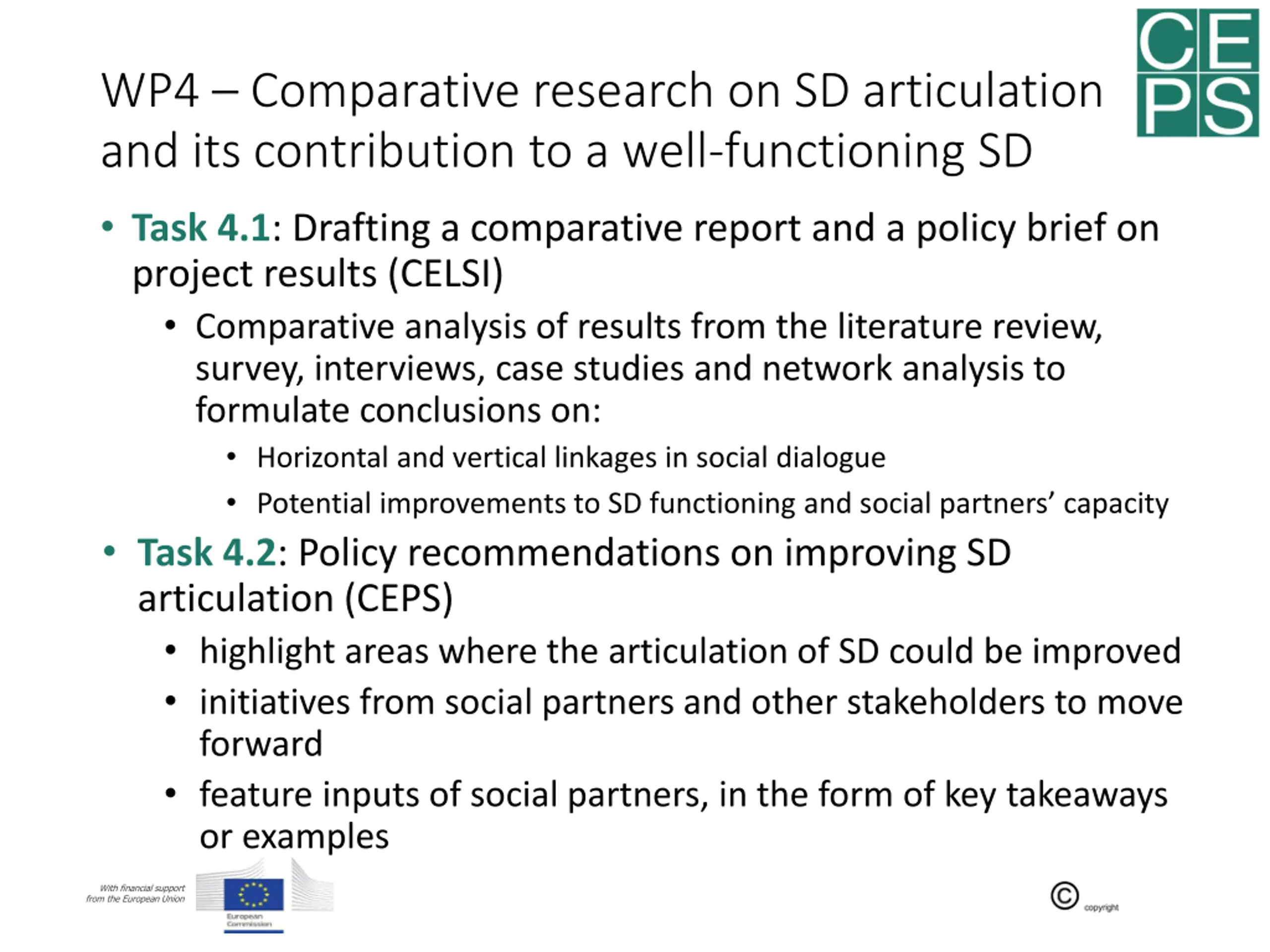 WP4 Comparative research on SD articulation and its contribution to a well-functioning SD Task 4.1: Drafting a comparative report and a policy brief on project results (CELSI) Comparative analysis of results from the literature review, survey, interviews, case studies and network analysis to formulate conclusions on: Horizontal and vertical linkages in social dialogue Potential improvements to SD functioning and social partners capacity Task 4.2: Policy recommendations on improving SD articulation (CEPS) highlight areas where the articulation of SD could be improved initiatives from social partners and other stakeholders to move forward feature inputs of social partners, in the form of key takeaways or examples With financial support from the European Union