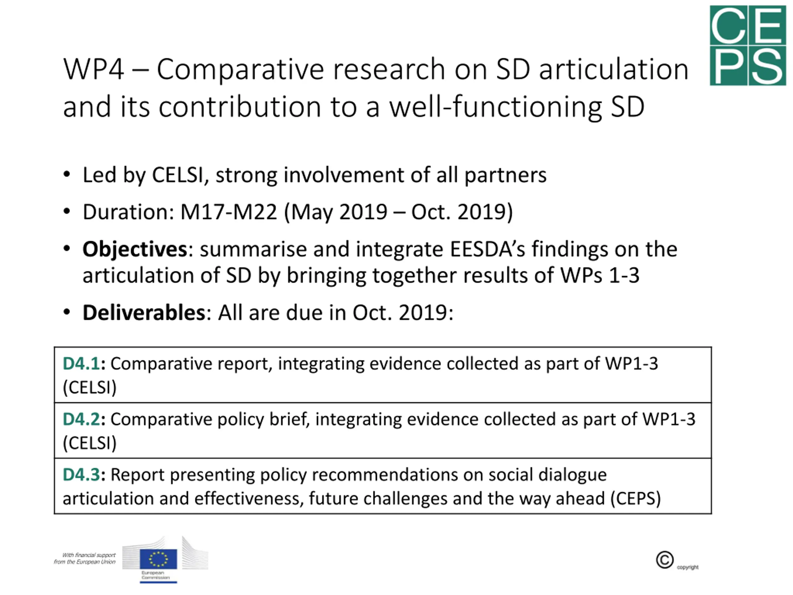 WP4 Comparative research on SD articulation and its contribution to a well-functioning SD Led by CELSI, strong involvement of all partners Duration: M17-M22 (May 2019 Oct. 2019) Objectives: summarise and integrate EESDA s findings on the articulation of SD by bringing together results of WPs 1-3 Deliverables: All are due in Oct. 2019: D4.1: Comparative report, integrating evidence collected as part of WP1-3 (CELSI) D4.2: Comparative policy brief, integrating evidence collected as part of WP1-3 (CELSI) D4.3: Report presenting policy recommendations on social dialogue articulation and effectiveness, future challenges and the way ahead (CEPS) With financial support from the European Union