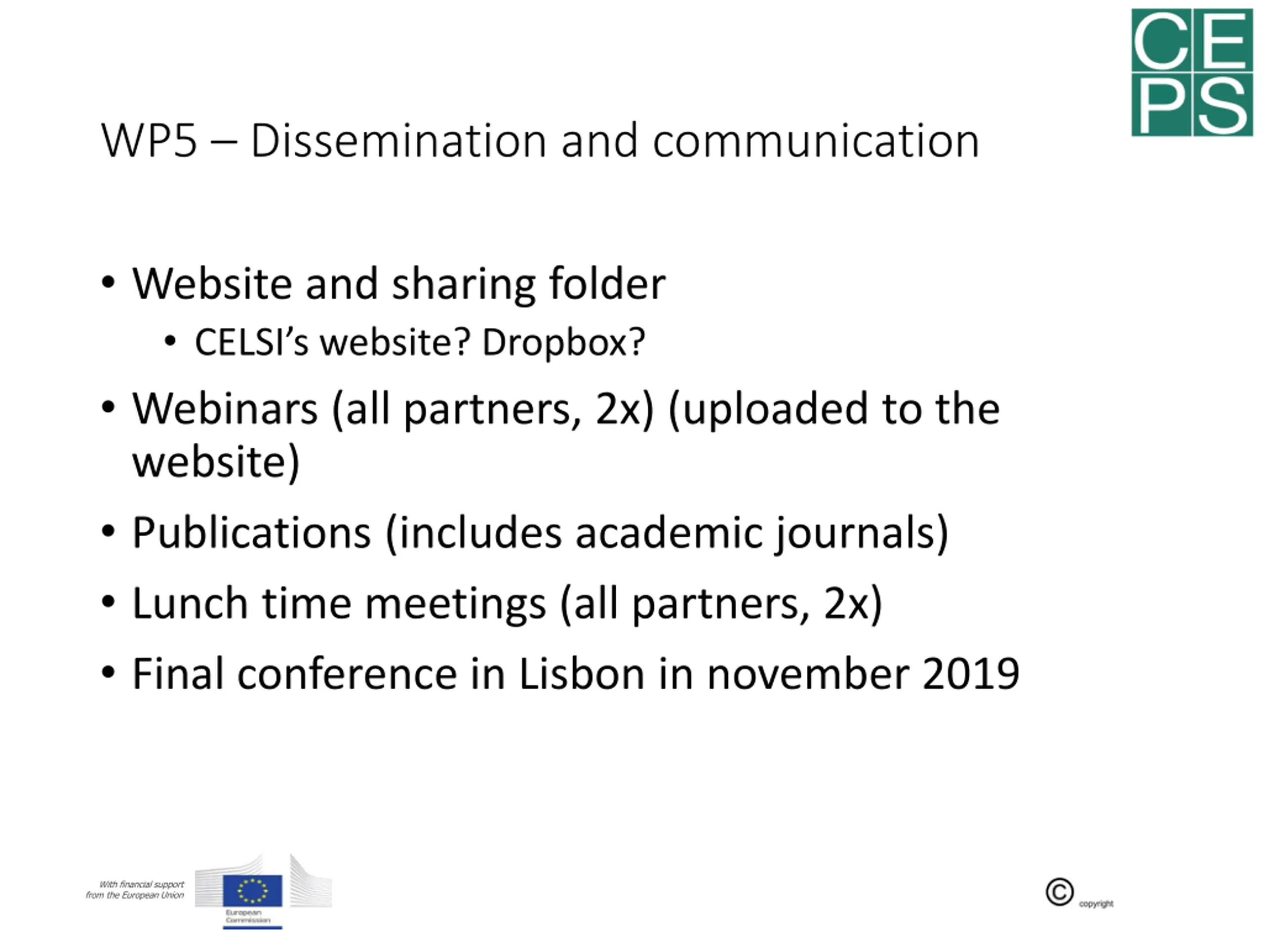 WP5 Dissemination and communication Website and sharing folder CELSI s website? Dropbox? Webinars (all partners, 2x) (uploaded to the website) Publications (includes academic journals) Lunch time meetings (all partners, 2x) Final conference in Lisbon in november 2019 With financial support from the European Union